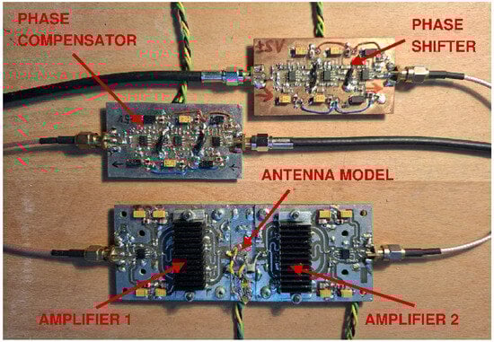 For the practical realization of the demonstrator system, dedicated circuitry had to be developed and crafted (Figure 17). Since the load impedance is not even close to 50 Ohm as in traditional transmitters, antenna feed lines should not be used, but instead the amplifier bridge output and antenna model input are connected as close as physically possible (Figure 17). The signal was generated using a DDS harmonic generator, while the amplifiers 1 and 2 (Figure 17) were identical. In the schematic diagram in Figure 9b the generator Vg’ has a positive output connected to the negative output of Vg. For practical realization with single-ended amplifiers this is inconvenient, hence two counterphase outputs from the sinewave generator were used and both amplifiers had output referenced to the ground. Instead of a counterphase generator output, an inverting unity gain stage could have been used in the signal path of either amplifier 1 or amplifier 2.