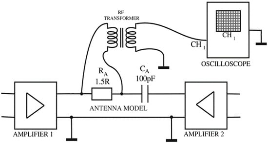 Obtaining an accurate power measurement of the antenna radiation resistance hardware model (resistor RA) was a challenging task. The main problem was that neither terminal of RA is grounded (Figure 16), as RA is connected between the two amplifier outputs, making RA a “floating” load. To measure a low differential voltage across RA while the common-mode voltage is several orders of magnitude higher, an RF transformer (balun) CX2040LNL [28] was used (Figure 19) to feed the standard ground-referenced (asymmetrical) high-impedance oscilloscope input.