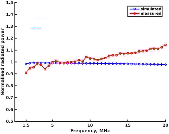 Radiated power of coherent current and voltage source system (power level relative to simulated result at the lowest operating frequency).