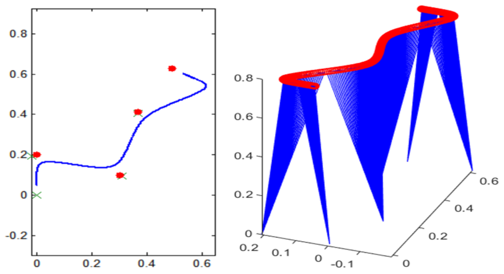 17], this paper plans to use a single step of 20 cm and a step width of 20 cm, with a center of mass height of 80 cm. The trajectory and landing position of the robot are drawn separately in