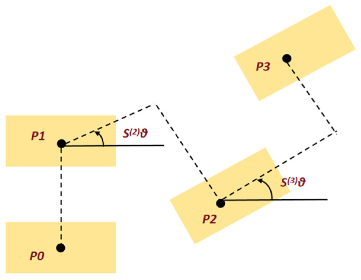 18]. Using the new support point as the coordinate origin and setting the termination state of the previous support point as the initial condition, the robot promptly enters a new round of single-leg inverted pendulum motion. By sequentially connecting these linked single-leg inverted pendulum phases, a continuous and smooth walking pattern is ultimately constructed. When the robot needs to turn to increase the rotation angle, the trajectory diagram of the turn is shown in