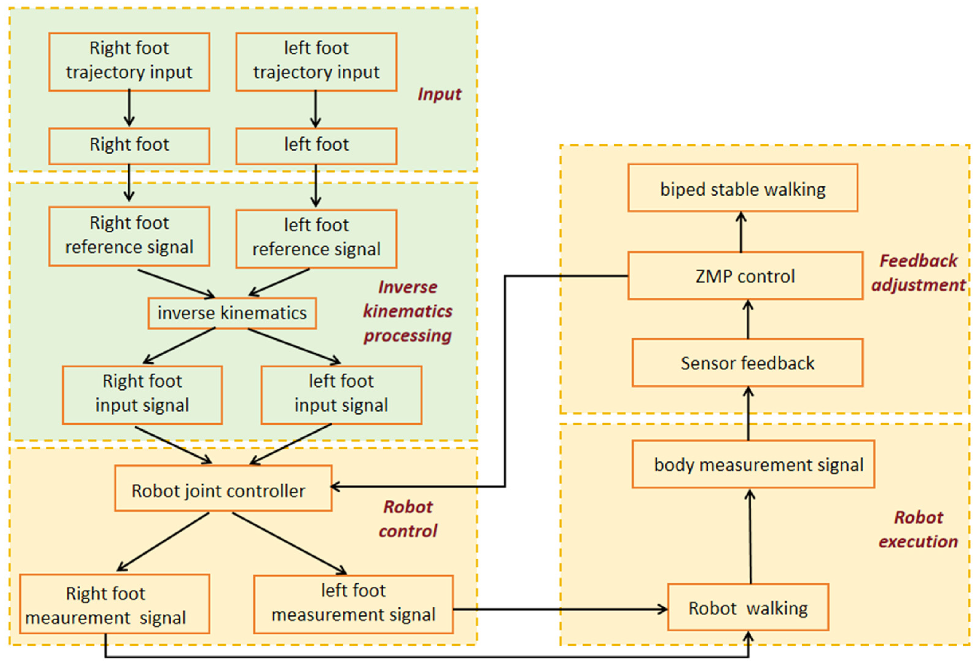 As the single-leg support phase is about to conclude, simply placing the other foot precisely in the correct position allows the humanoid robot’s center of mass to establish a new support reference [