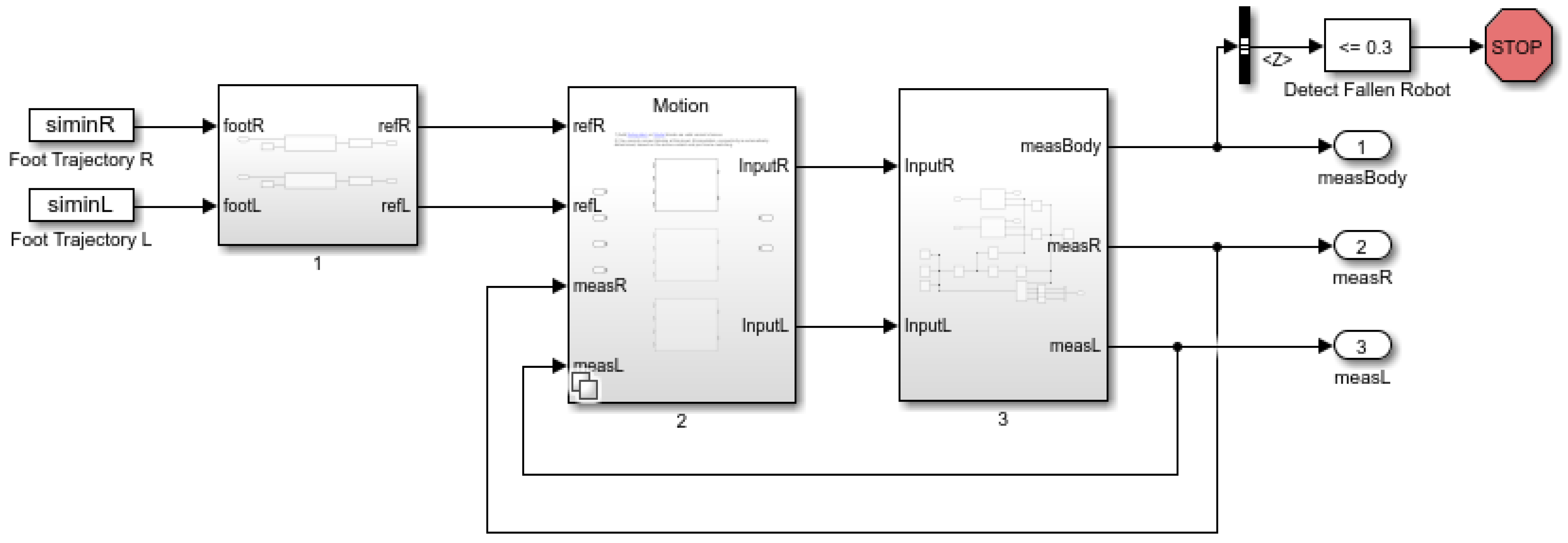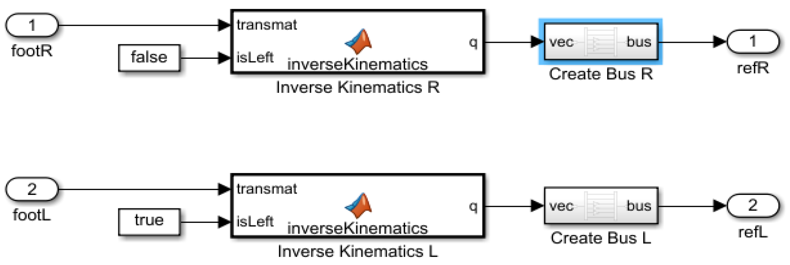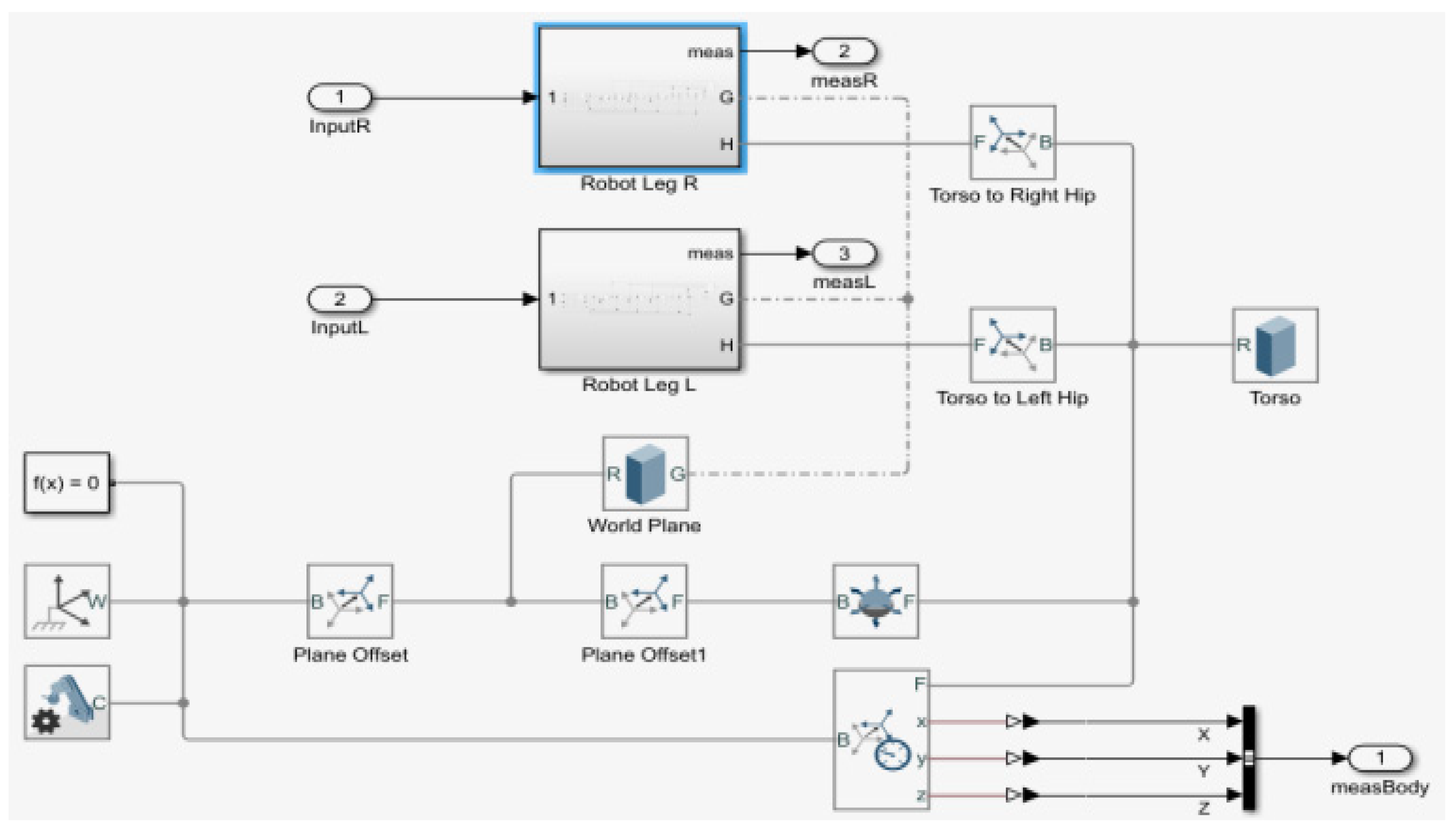 Figure 5. This interface, implemented in MATLAB/Simulink 2019, initializes the robot’s dynamic model and controller parameters, forming the foundation for all subsequent simulations. It is structured into three distinct functional panels. A complete robot kinematic modeling system is constructed based on specific parameter settings to accurately control the balance and motion of the humanoid robot in three-dimensional space. This interface initializes the robot’s dynamic model and controller parameters, forming the foundation for all subsequent simulations. It is structured into three functional panels: