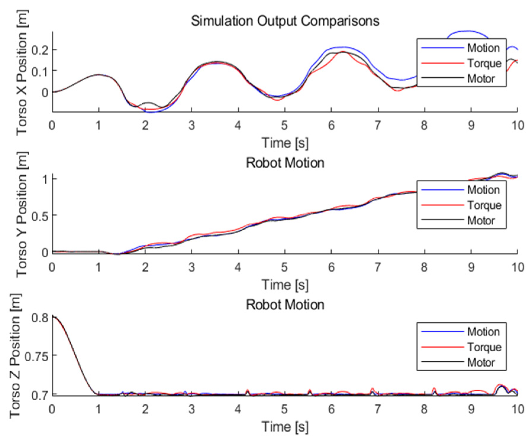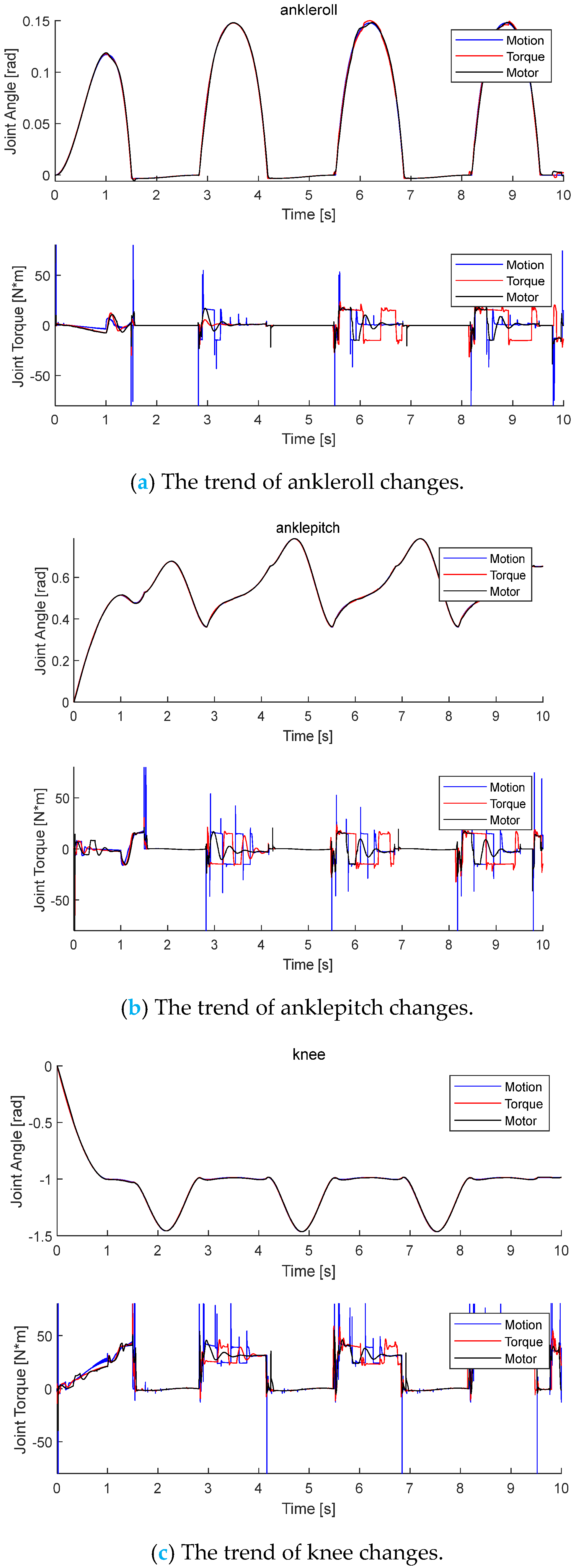 MATLAB 2019 software is used to simulate and verify the established model, and the simulation results are analyzed. In practical operation, due to factors like mechanical structural errors, inherent model deviations, and ground friction, there is a certain deviation between the actual and expected gait of the robot. If errors continue to accumulate, it will cause the robot to become imbalanced and capsize. In order to ensure the stable walking of the humanoid robot, the real-time calibration is required. Under no interference condition, the gait information generated by the walking pattern generator will directly drive robot to walk stably. However, there are significant differences between the robot’s actual gait and the gait output by the generated program. It is necessary to use a walking stability controller, combined with sensor feedback information, to perform real-time online control of actual gait to reduce gait errors and maintain the robot dynamic balance.