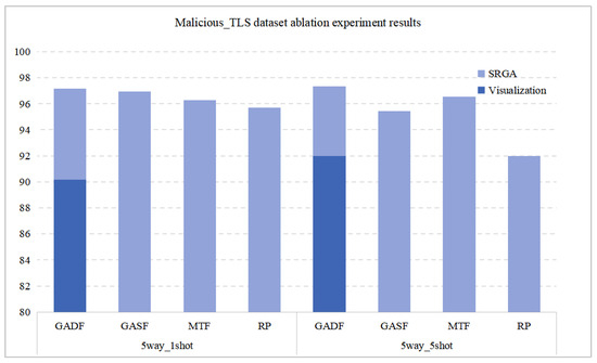 Table 5, bold font denotes the best result, and underlined font denotes the suboptimal result. When the GADF method is used to convert traffic data into images for few-shot experiments, the improvement in model performance is significant when combined with the SRGA module. In the 5-way 1-shot setting, the proposed method achieves an accuracy 7.02% higher than that of the model without the SRGA module. Experiment 1 demonstrates that the SRGA module can effectively improve the accuracy of few-shot classification. Comparative experiments were further conducted in Experiments 2–5 by combining the SRGA module with different traffic visualization methods. When the GADF method is adopted in this study, the accuracies in the 5-way 1-shot and 5-way 5-shot settings both achieve the highest values, which are 97.17% and 97.34% respectively. Specifically, in the 5-way 1-shot setting, the accuracy is 0.21%, 0.89%, and 1.47% higher than those of the GASF, MTF, and RP methods; in the 5-way 5-shot setting, the accuracy is 1.91%, 0.78%, and 5.36% higher than those of the GASF, MTF, and RP methods. Different traffic data visualization methods have different impacts on model performance. In the ablation experiment on the Malicious_TLS dataset, the accuracy of GADF-SRGA on task 5way_1shot and 5way_5shot was 97.17% and 97.34%, respectively, achieving the best performance among all ablation experiments. The visualization of the results is shown in