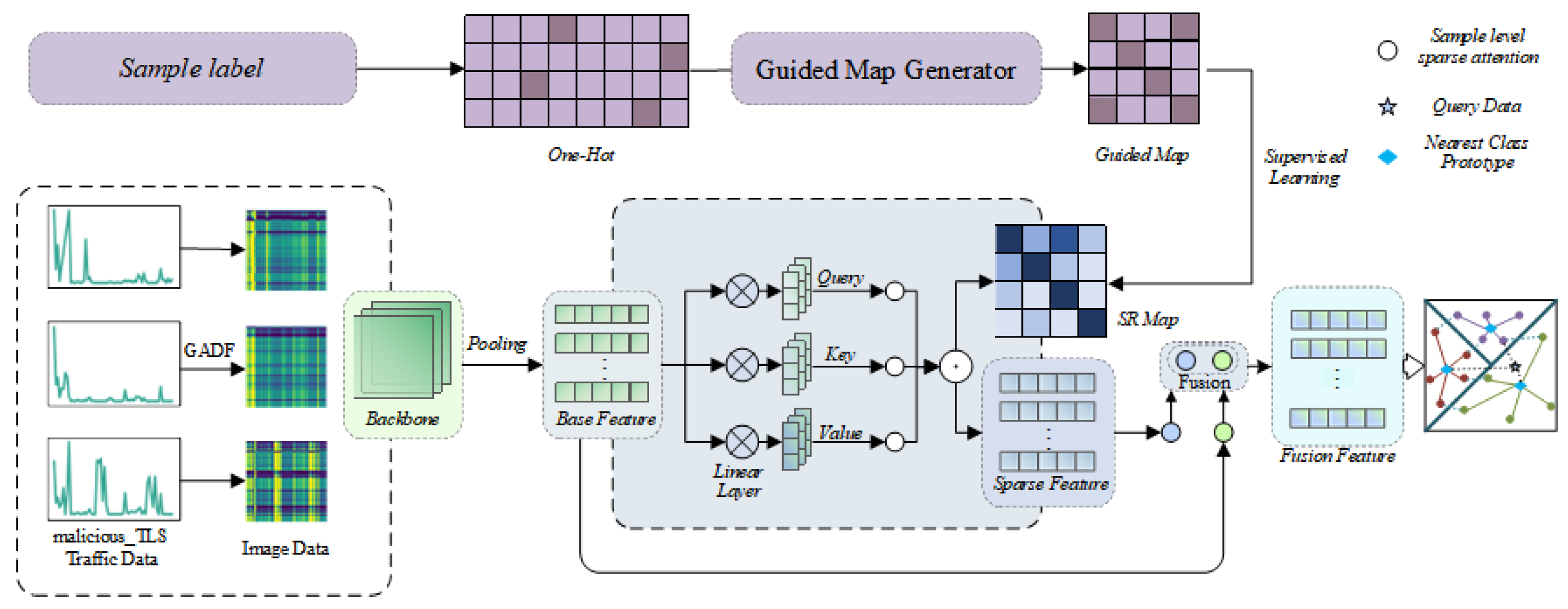 , thereby achieving more compact intra-class clustering of malicious traffic samples in the feature space from a global perspective and further enhancing the model’s generalization ability for few-shot novel malicious traffic.