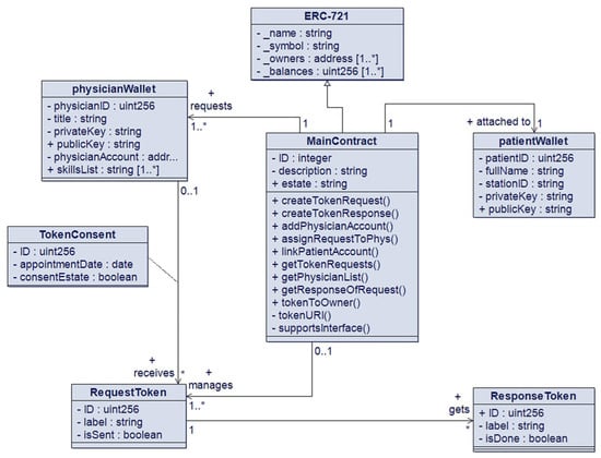 The ERC-721 standard defines the essential functionalities for managing non-fungible tokens (NFTs), primarily designed for finance-oriented transactions []. However, several of its native operations are not directly compatible with the requirements of information management, particularly when handling non-fungible medical entities such as patient identities or unique medical records. To address these limitations and following the MDA approach, we propose an extended smart contract model that inherits from ERC-721 while redefining and enriching specific features to accommodate healthcare-specific needs. Consequently, the ERC-721 specification is adopted as the foundational token model for designing a medical-oriented smart contract pattern, derived from the metamodel illustrated in Figure 3. The central component, referred to as MainContract, constitutes the core module deployed and executed on-chain, incorporating customized functions such as the following: