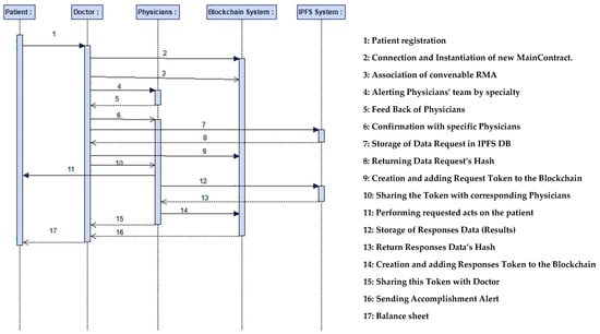The RequestToken and ResponseToken modules in the proposed design pattern, shown in Figure 3, play a pivotal role in implementing the consent management mechanism. They govern and secure access to each component of patient’s RMA, the data of which is stored off-chain within the IPFS distributed storage system. To preserve both the integrity and confidentiality of medical information while ensuring logical and auditable interactions among healthcare actors, a tokenization-based workflow is designed. This workflow models the creation, exchange, and validation of consent tokens through smart contract operations. The complete interaction process is illustrated in the sequence diagram shown in Figure 4, which depicts the chronological execution of transactions and the communication between the participating entities (doctor, specialist, patient, IPFS storage, and smart contract).