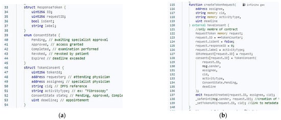 Smart contract Solidity code: consent and structured medical metadata (a), createTokenRequest function (b).