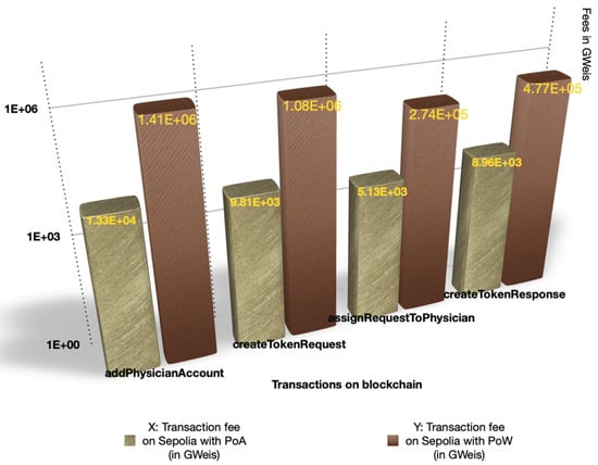 Table 2 summarizes the obtained results, presenting the transaction costs (expressed in Gwei) for both experimental configurations (X and Y) as well as the cost difference (Δ = Y − X) between them. And as illustrated in Figure 10 and Figure 11, the overall transaction fees, including both smart contract deployment and function execution, are significantly lower under the PoA consensus mechanism. In contrast, the Proof-of-Work (PoW) configuration exhibits substantially higher gas consumption and transaction costs due to its computationally intensive validation process. These results clearly demonstrate that adopting the PoA mechanism enables the proposed framework to operate with minimal transaction overhead, achieving a notable reduction in energy consumption and operational costs while maintaining the required level of security and traceability for medical workflows.