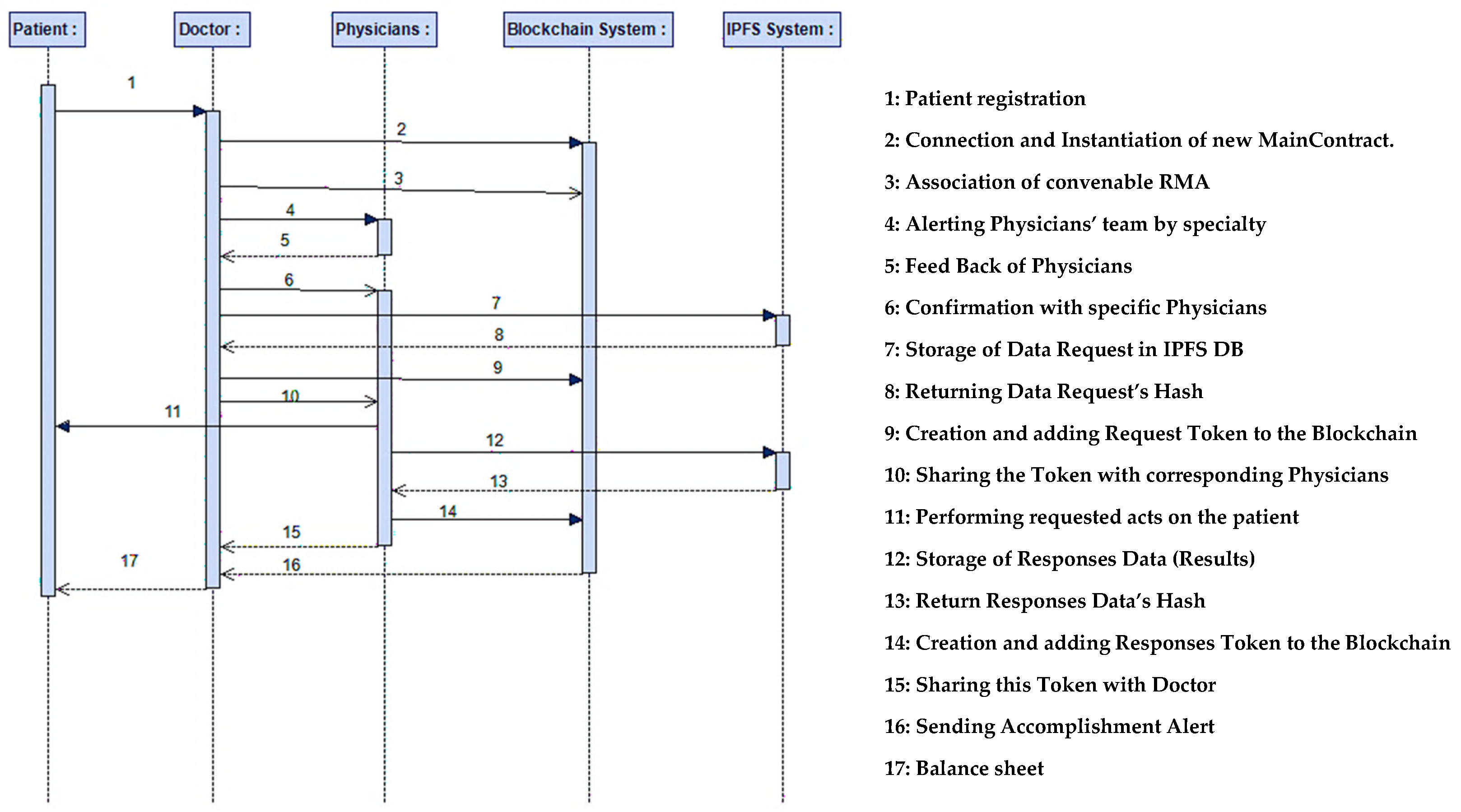 Figure 4, which depicts the chronological execution of transactions and the communication between the participating entities (doctor, specialist, patient, IPFS storage, and smart contract).