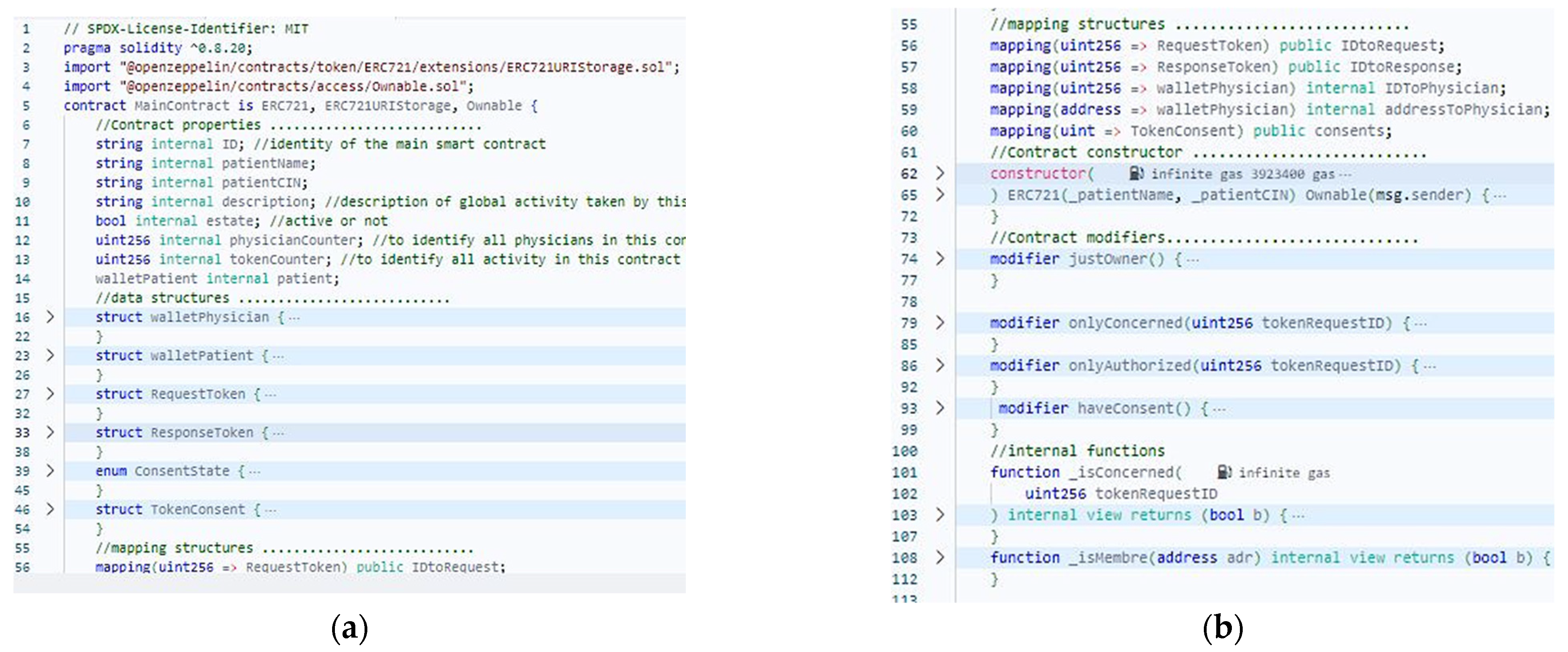 Solidity artifacts integrated into the smart contract to ensure supervision, traceability, and access control of medical activities.