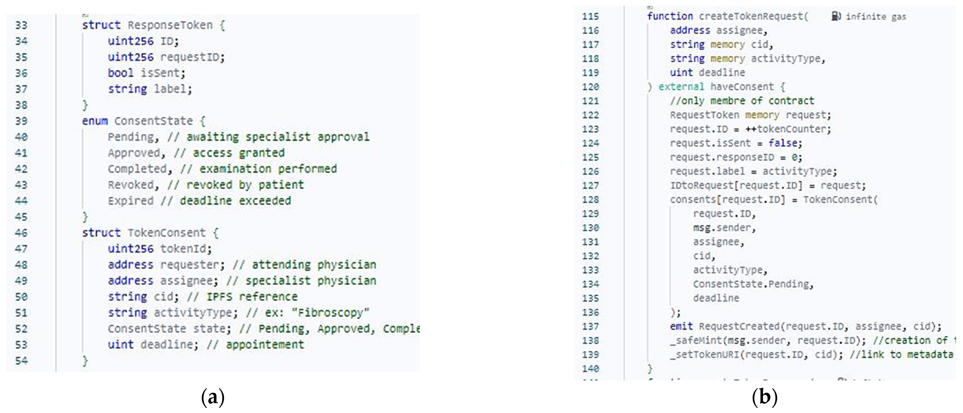 Figure 6b), or a medical result via createTokenResponse, among others. Based on the configuration of the TokenConsent structure, the smart contract automatically infers access authorizations and monitors workflow progression.