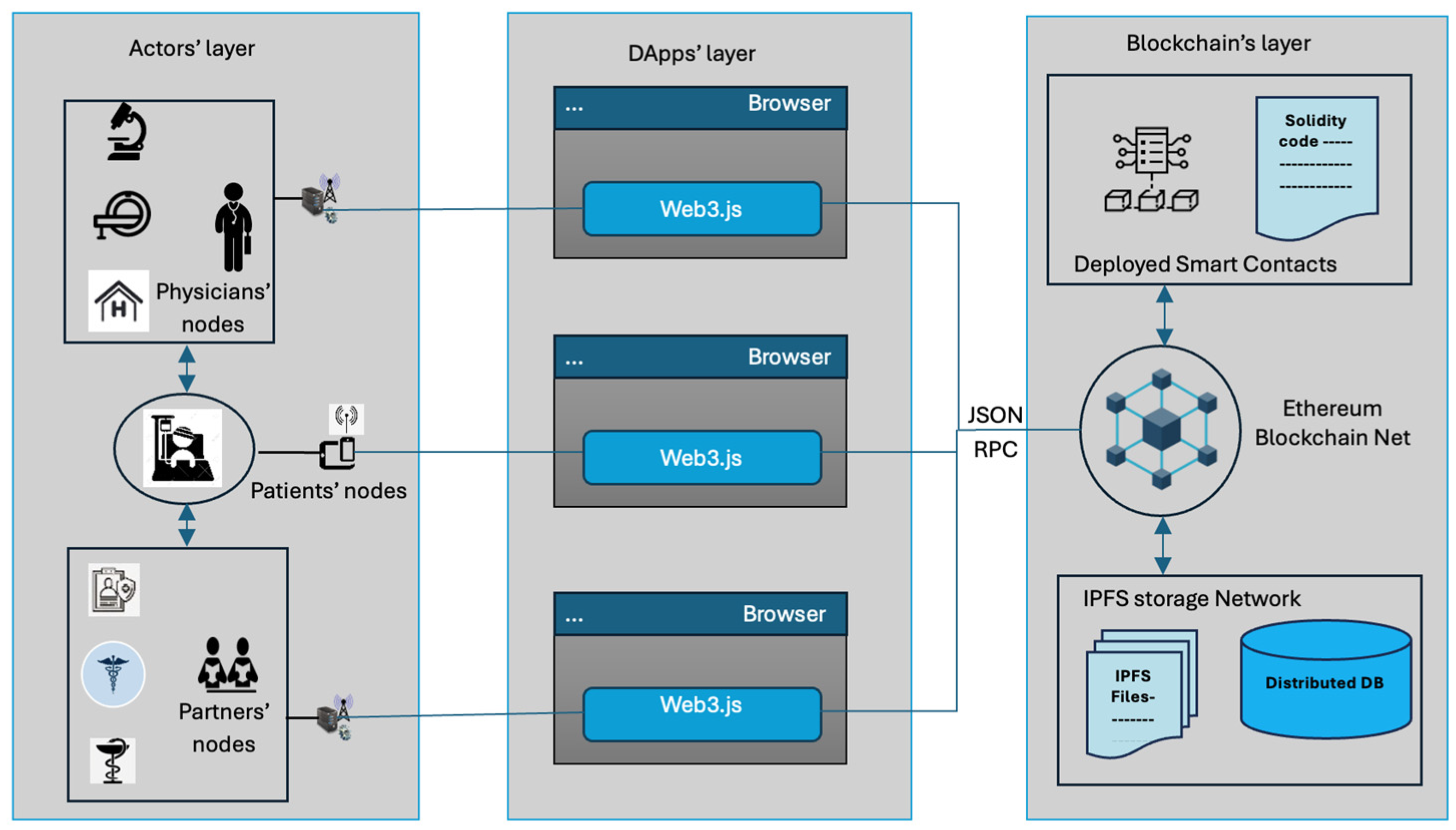 Application Layer: This layer hosts DApps, developed using Web3 technologies, which serve as the interaction interface between system actors (patients, physicians, and partners) and the underlying blockchain. It manages user authentication, contract deployment, signature operations, and transaction handling, ensuring seamless communication across heterogeneous platforms using JSON/RPC standards.
