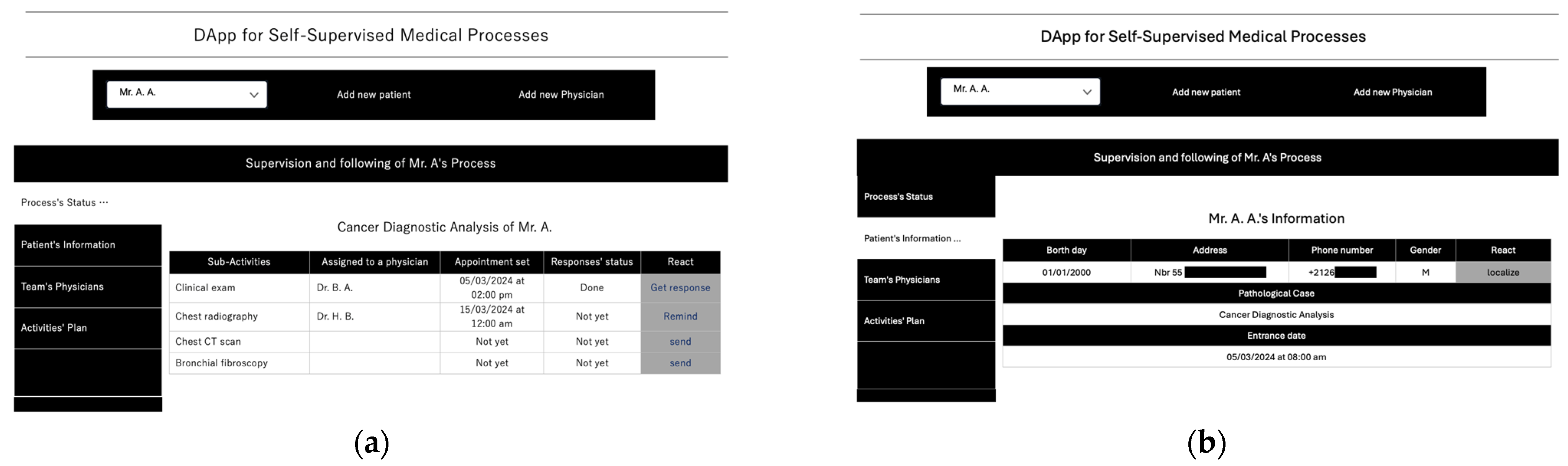The patient can also monitor the progress of their diagnostic process through the DApp. This interface allows the patient to visualize the status of each medical sub-activity and locate the involved healthcare professionals according to the previously scheduled appointments. All interactions are securely managed through the corresponding MainContract instance on the blockchain, thereby ensuring complete traceability, data integrity, and transparent coordination throughout the entire medical workflow.
