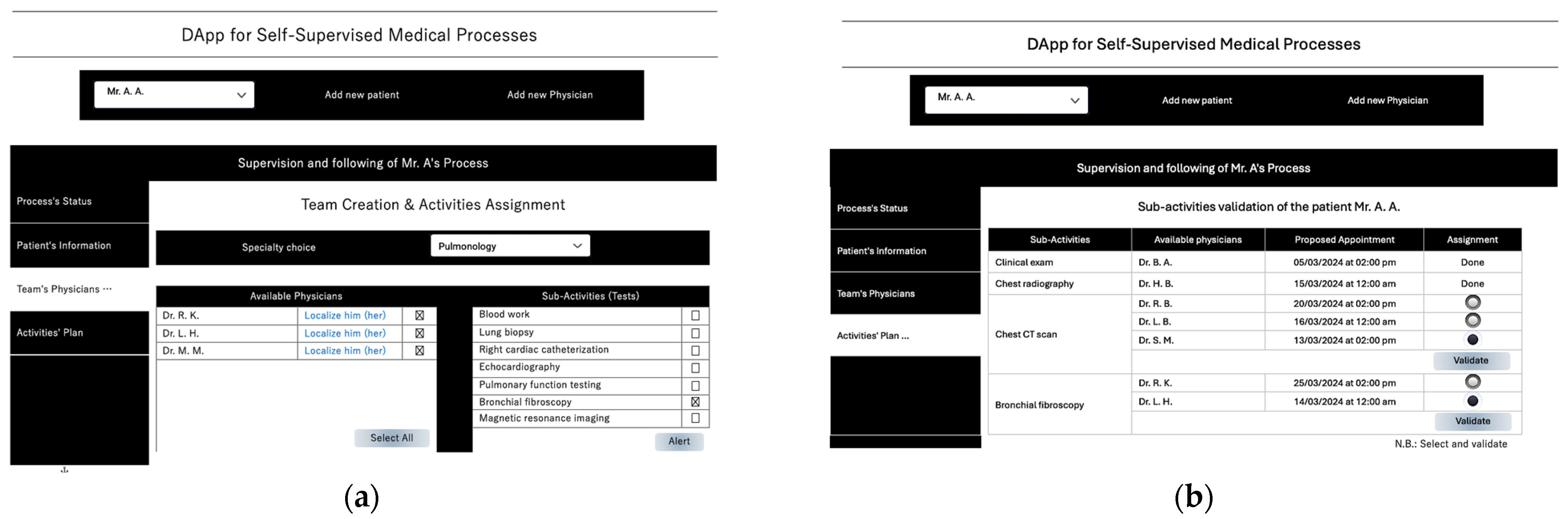 Figure 9a, the interface allows the doctor to select, for each required specialty, available physicians based on their geographical localization and professional profiles. In the next step, the attending physician specifies the medical tests or sub-activities to be performed and sends invitations (alerts) to the selected specialists. Each sub-activity displays a list of available physicians, along with their proposed appointment time. The attending physician then selects the most suitable specialist, considering time, location, and estimated cost. By clicking the “validate” button, a RequestToken is automatically generated and transmitted to the selected physician, granting them authorized access to the attending doctor’s request through the smart contract. Upon receiving all required confirmations, the medical team composition is finalized, marking the completion of the CDA’s workflow.