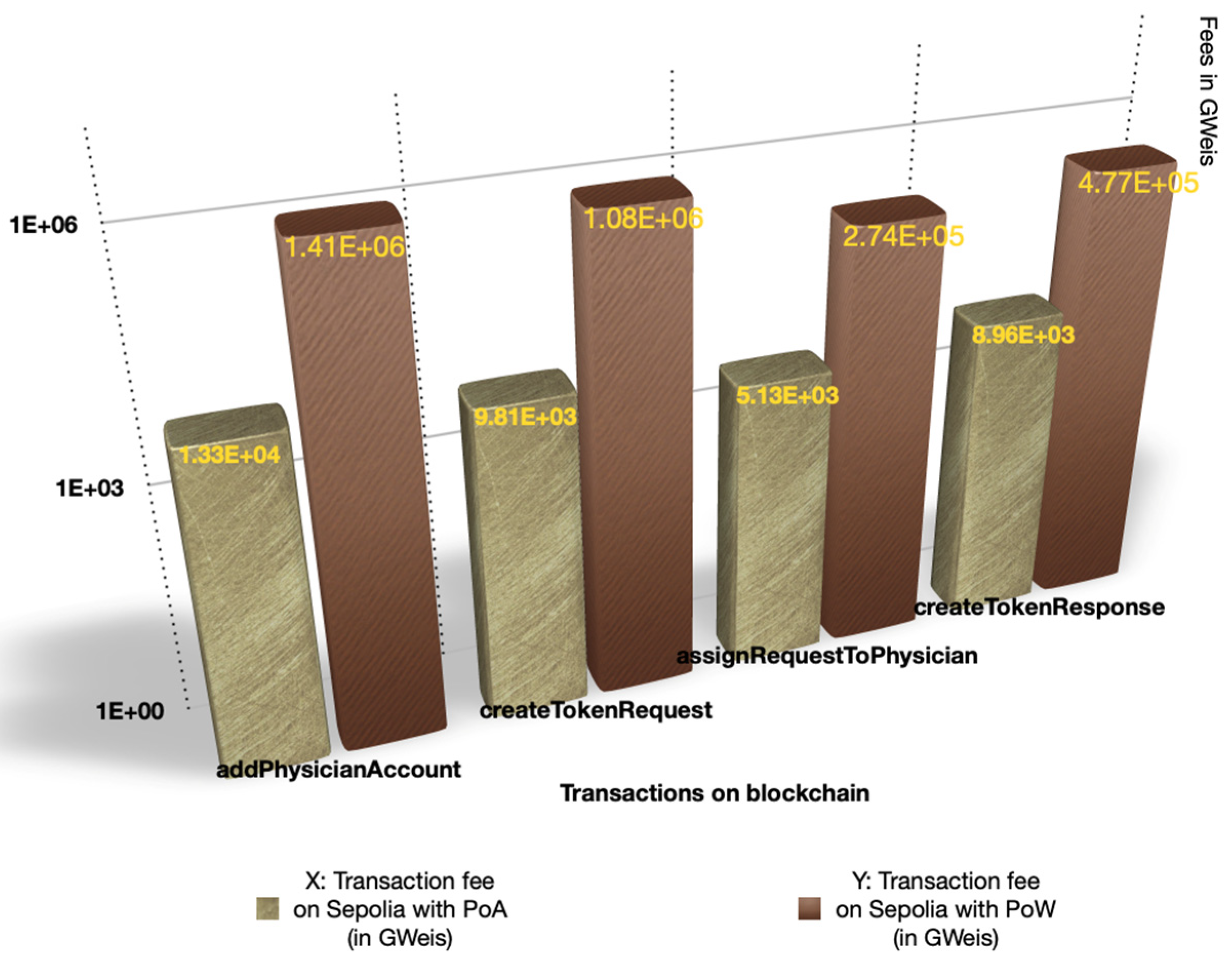 Figure 11, the overall transaction fees, including both smart contract deployment and function execution, are significantly lower under the PoA consensus mechanism. In contrast, the Proof-of-Work (PoW) configuration exhibits substantially higher gas consumption and transaction costs due to its computationally intensive validation process. These results clearly demonstrate that adopting the PoA mechanism enables the proposed framework to operate with minimal transaction overhead, achieving a notable reduction in energy consumption and operational costs while maintaining the required level of security and traceability for medical workflows.