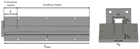 with being the larger dimensions of each of the feeding- and guiding-region waveguides. Though is fixed and established according to the WR51-standard, the choice of will follow some criteria described in the following section with the aim of avoiding the excitation of higher-order modes in the guiding region.