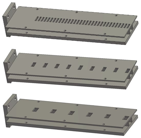 Finally, the upper wall with the slotted periodic pattern is designed as well. The periodicity p is chosen to satisfy the requirements in (17), (21), and (24) to induce single-, double-, and triple-beam emission. For each case, the width of the slots w is selected to ensure that the field propagated inside the antenna leaks out [37]. A summary of the values employed for each antenna is found in Table 1. As can be seen, the transition and guiding region shares the same structure parameters for each leaky-wave antenna. Otherwise, the periodicity and width of the slots of the upper wall varies for each of the three antenna models. Figure 3 shows a sketch of each full model of the leaky-wave antenna.