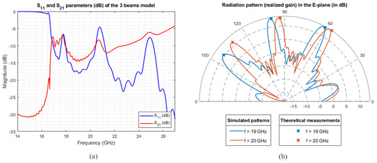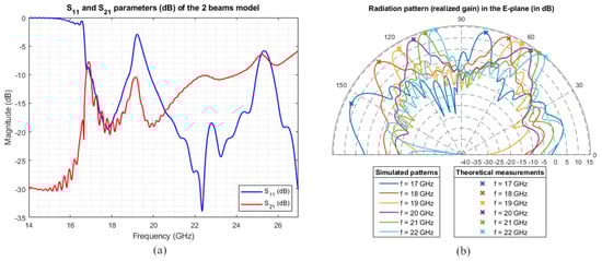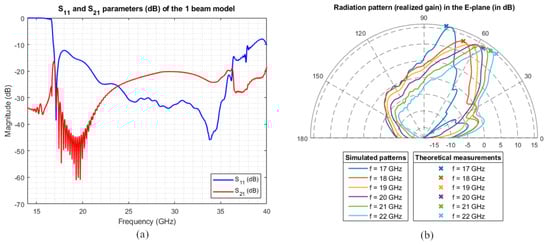 The performance of the leaky-wave antenna for the single-beam case is shown in Figure 4. In Figure 4a, the reflection and transmission coefficients are evaluated from the feeding waveguide in terms of the scattering parameters and , respectively. The -parameter estimates the fraction of power coming back to the feeding structure, while computes the fraction of power going out from the opposite side. Figure 4b evaluates the beam direction for different frequencies from 17 to 22 GHz. As can be inferred from both figures, the performance of the antenna is quite good, having below dB, as well as showing the pointing directions of the beam in the predicted positions. This ensures that most of the power leaks out.
