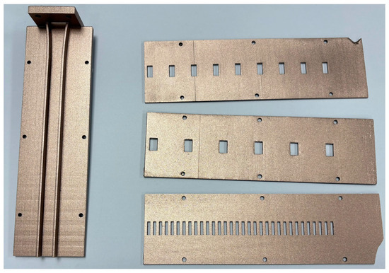 The manufacturing process has been carried out via stereolithography by means of the 3D-printer model Formlabs Form 3+ [36]. After that, a thin metal coating was applied to all the printed pieces by using RS Pro Bronze spray [38]. Figure 7 shows the final products, where the transition region, the guiding region, and the three upper walls are exhibited. It is worth remarking that the conductivity of the spray is not as high as desired; about S/m. This constraint will have influence over the final radiation patterns expected for each antenna configuration.