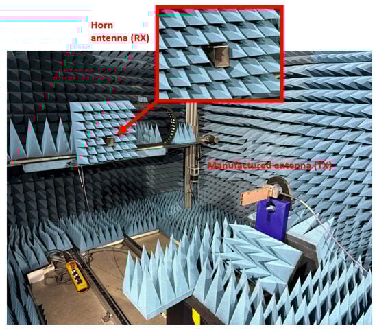 The experimental campaign took place in the anechoic chamber of the SWAT group of the University of Granada [39]. The leaky-wave antennas (Tx) were placed in a rotatory platform, which made a around a fixed horn antenna WR51 operating between 15–22 GHz. This horn antenna (Rx) collected the signals emitted from the leaky-wave antennas as they were rotating. A VNA is connected to the Tx and Rx antennas, introducing and recording the input and output signals, respectively. Figure 8 shows the leaky-wave antenna in the support, whereas Figure 9 illustrates a global vision of the whole experimental setup.