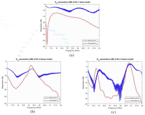 This section presents the experimental results, with the aim of testing the fully metallic, low-cost, and reconfigurable leaky-wave antenna in the laboratory. The first test consists of evaluating the scattering parameter of the leaky-wave antenna for the three different configurations. Figure 10a–c show a comparison between the simulated and experimental -parameter for the single-, double-, and triple-beam models, respectively. It is observed that although the trends of both curves are very similar in all cases and the trends are clearly followed, the experimental results are worse than expected, exhibiting values above −10 dB. This effect is mainly due to the low conductivity of the spray used for metalization of the pieces. Specifically, the low conductivity motivates the appearance of the skin-depth phenomenon, such that the field propagating inside the antenna progressively crosses the thin metal layer and may reach the dielectric part. The skin depth is evaluated according to [34]