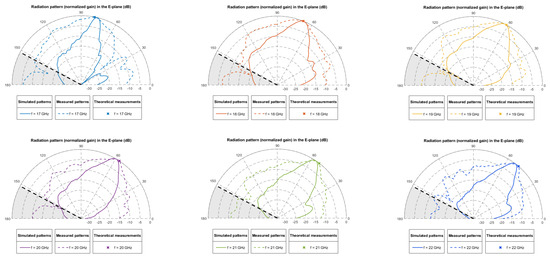 Despite the important constraints related to the metalization, the deterioration of the expected radiation diagrams was not so dramatic. Of course, the low conductivity leads to a substantial reduction in the quality factor of the antenna, manifesting as an increase in the beamwidth. But the pointing direction is respected, indicating that the main features of the leaky-wave antennas are still operative. Figure 11 shows the normalized gains obtained experimentally for the single-beam leaky-wave antenna in the range [17–22] GHz. In all cases, it has been compared with the simulated radiation patterns and the theoretical pointing angle.