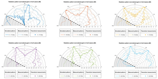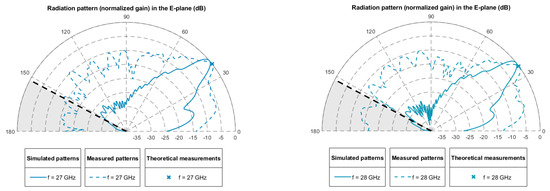 It can be seen that in the range analyzed, the pointing angles coincide (with an error of less than in the worst case) with those obtained in simulation. This demonstrates the validity of the theoretical study and the simulations carried out, as well as the correct design of the prototype that has been manufactured. This antenna has also been tested at higher frequencies, as shown in Figure 12. There, the radiation diagram obtained at 27–28 GHz is plotted. Again, the pointing directions between theoretical, simulated, and experimental results largely coincide, verifying the validity of the model even at these unexpected zone of the spectrum.