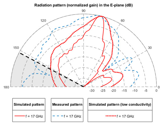 The widening of the beamwidth manifested in all radiation patterns is supposed to be due to the low-conductivity metallic coating. With the aim of testing this hypothesis, a simulation was performed by considering the leaky-wave antenna fabricated with a conductor having S/m. Figure 13 shows the radiation pattern at 17 GHz. Simulated results obtained in the ideal case (perfect conductor) and non-ideal case (low-conductivity conductor) are compared to those obtained experimentally. The widening of the radiation pattern is also manifested in simulations, thus reinforcing the assumption that low conductivity and wider beamwidth are correlated.