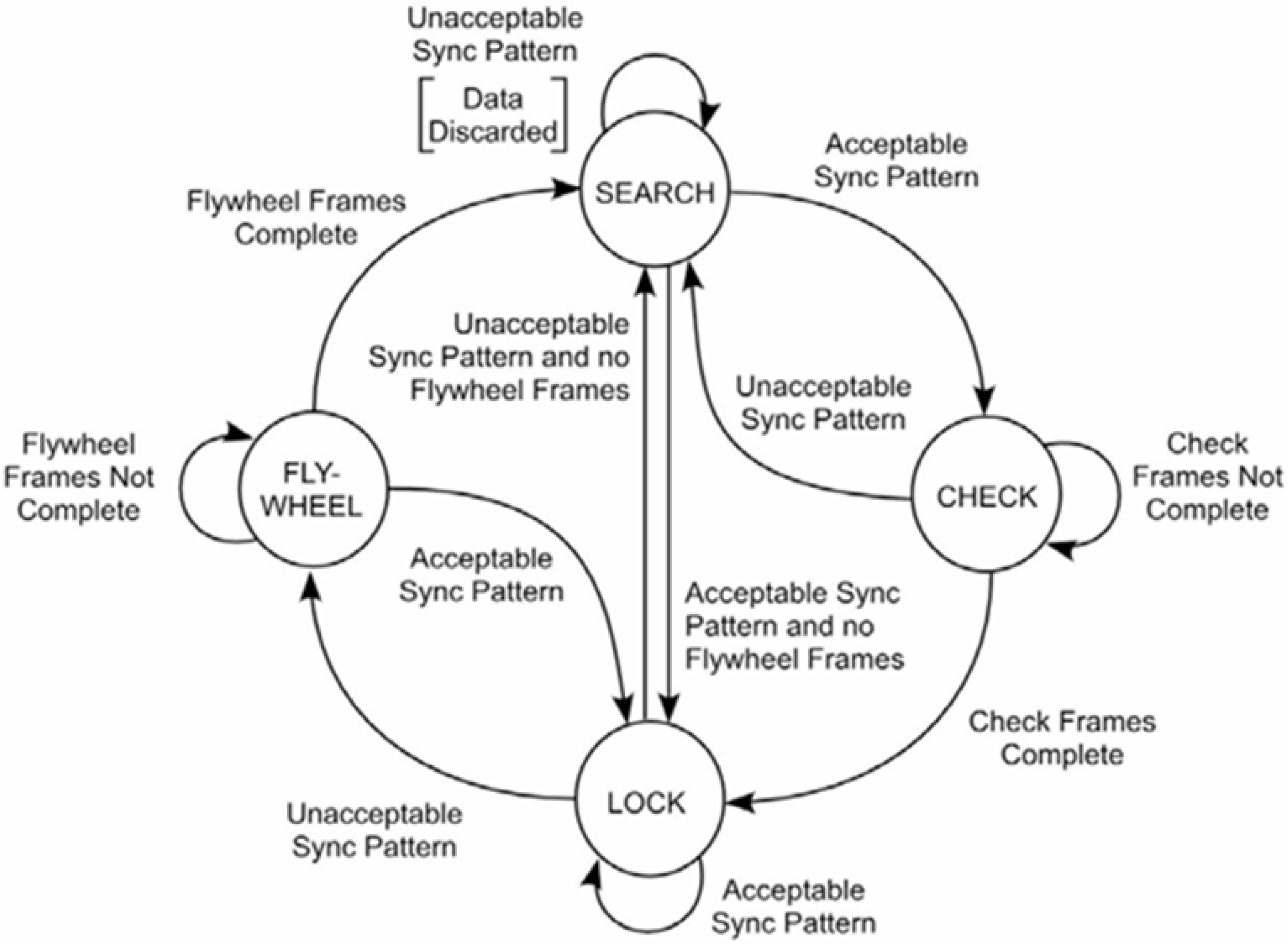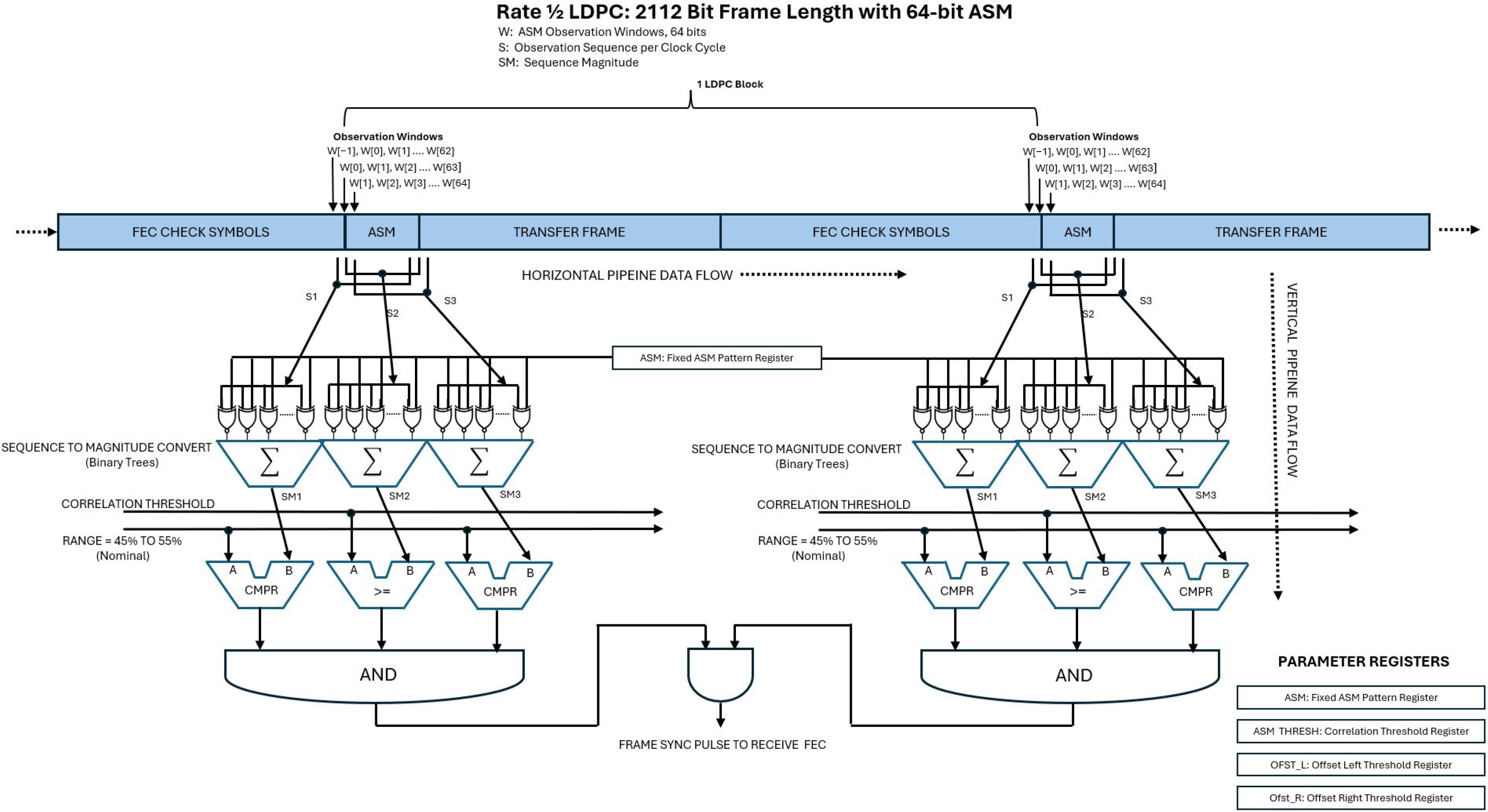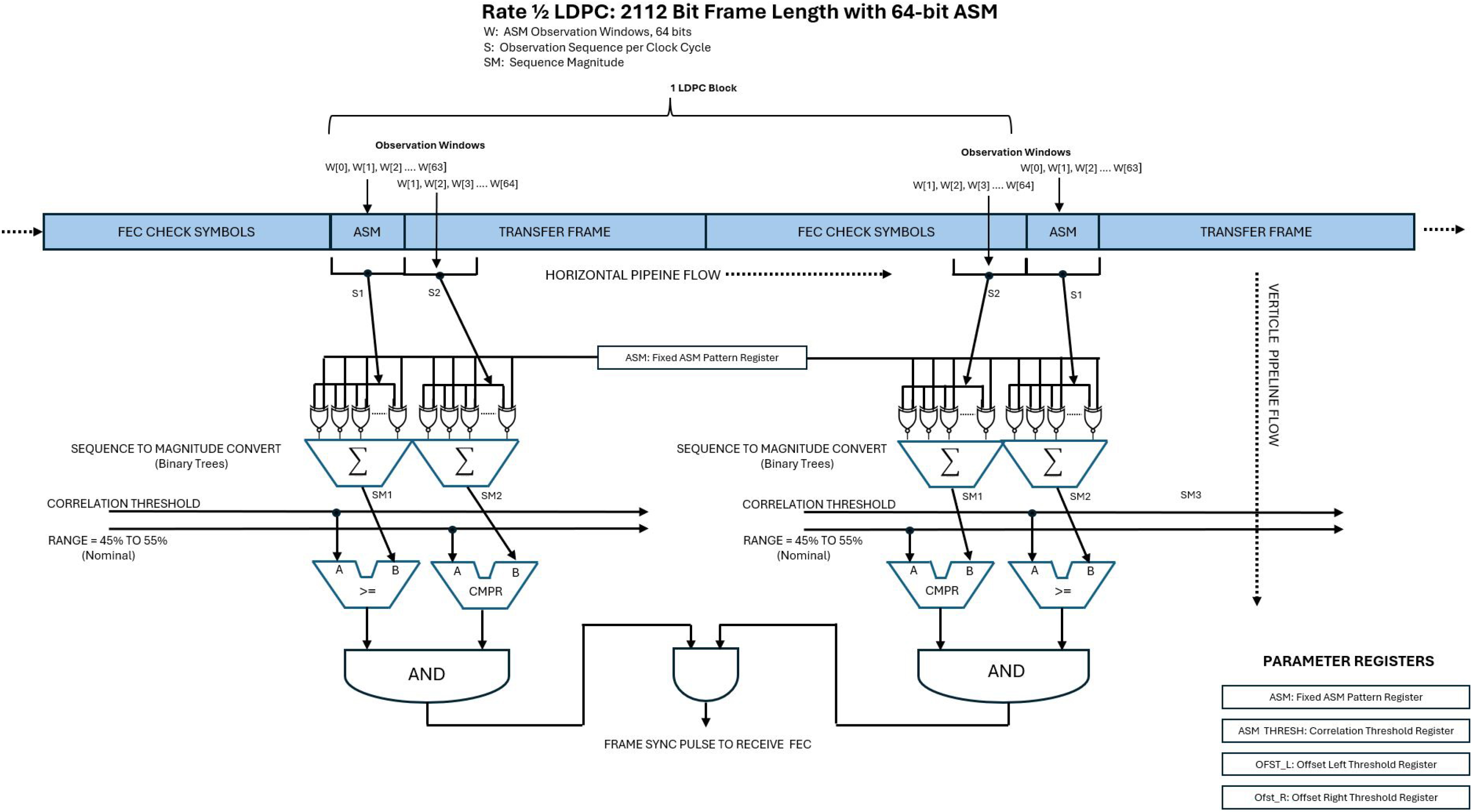 - Reduced Latency: A further benefit of a pure forward path pipelined structure is that there are no feedback paths to create “bubbles” in processing. Bubbles in this context are similar to processor instruction execution pipelines, where a process direction change, such as a branch instruction, causes a feedback or feedforward change of direction. Any partially processed pipeline stage function is thrown away, reducing the overall pipeline efficiency. In traditional FS, when a flywheel state machine synchronizer changes state from flywheel to search, a feedback path stops FEC code processing and returns to the starting “search” and “verify” states. During these states, FEC processing is suspended while frame synchronization lock is re-established. In our synchronizer, there is no state machine and thus there are no feedback paths, eliminating the FEC opportunity loss typical in flywheel FS state machines.