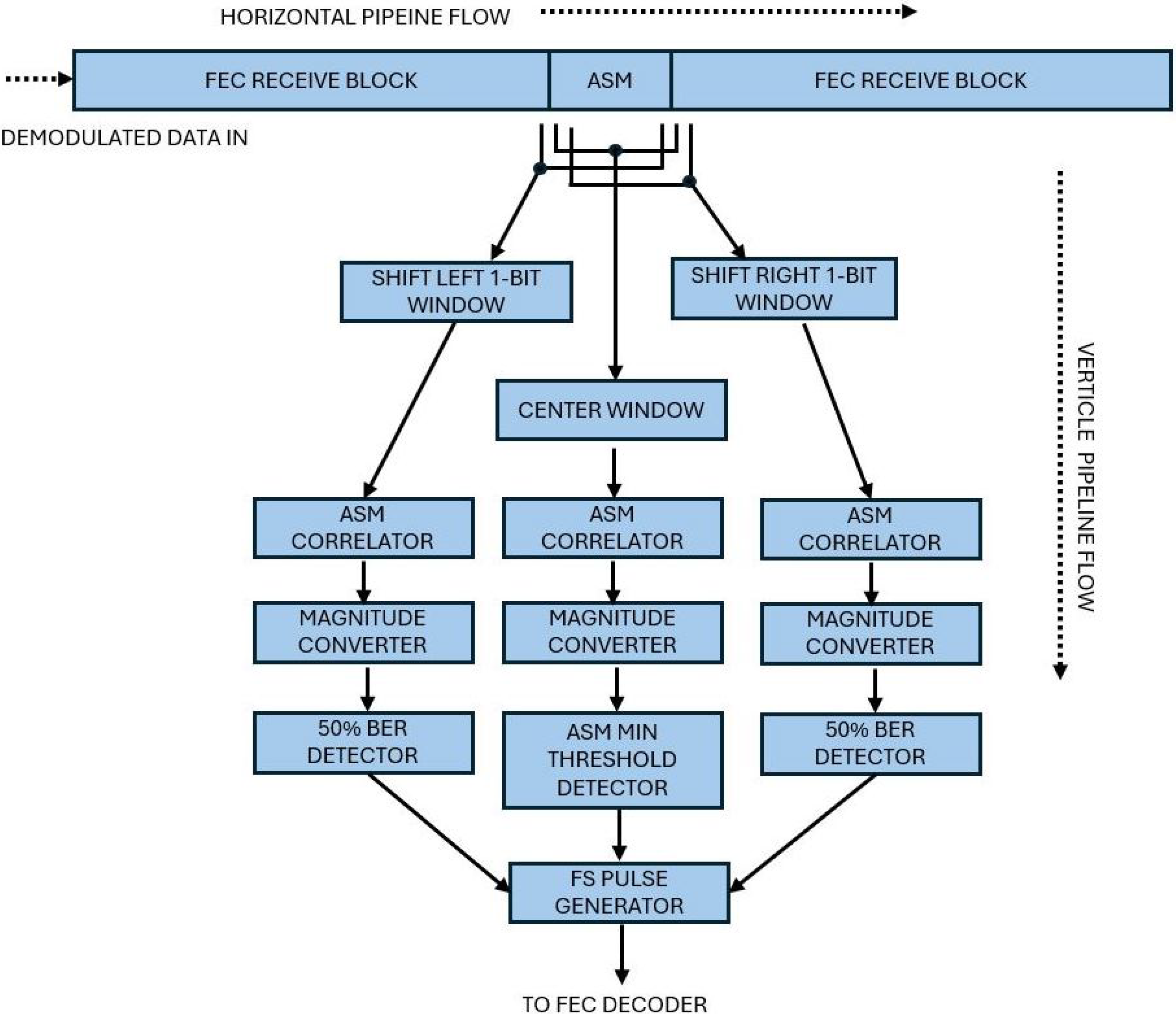 - Reduced Implementation Complexity: By implementing our Frame Synchronizer in a pure linear pipeline, with no feedback loops, and utilizing parallelism in combination, a symmetrical structure can be used in an FPGA, without requiring the complexity of a state machine. Parallelism and pipelining are good fits for FPGAs as they are fundamentally parallel processing devices. Although the resource utilization may increase, the implementation is still simpler as no state machine analysis is required. Once the pipeline starts and is operational, a Frame Sync decision (pulse) appears at the pipeline output every clock cycle without complex decision making typical of state machines.