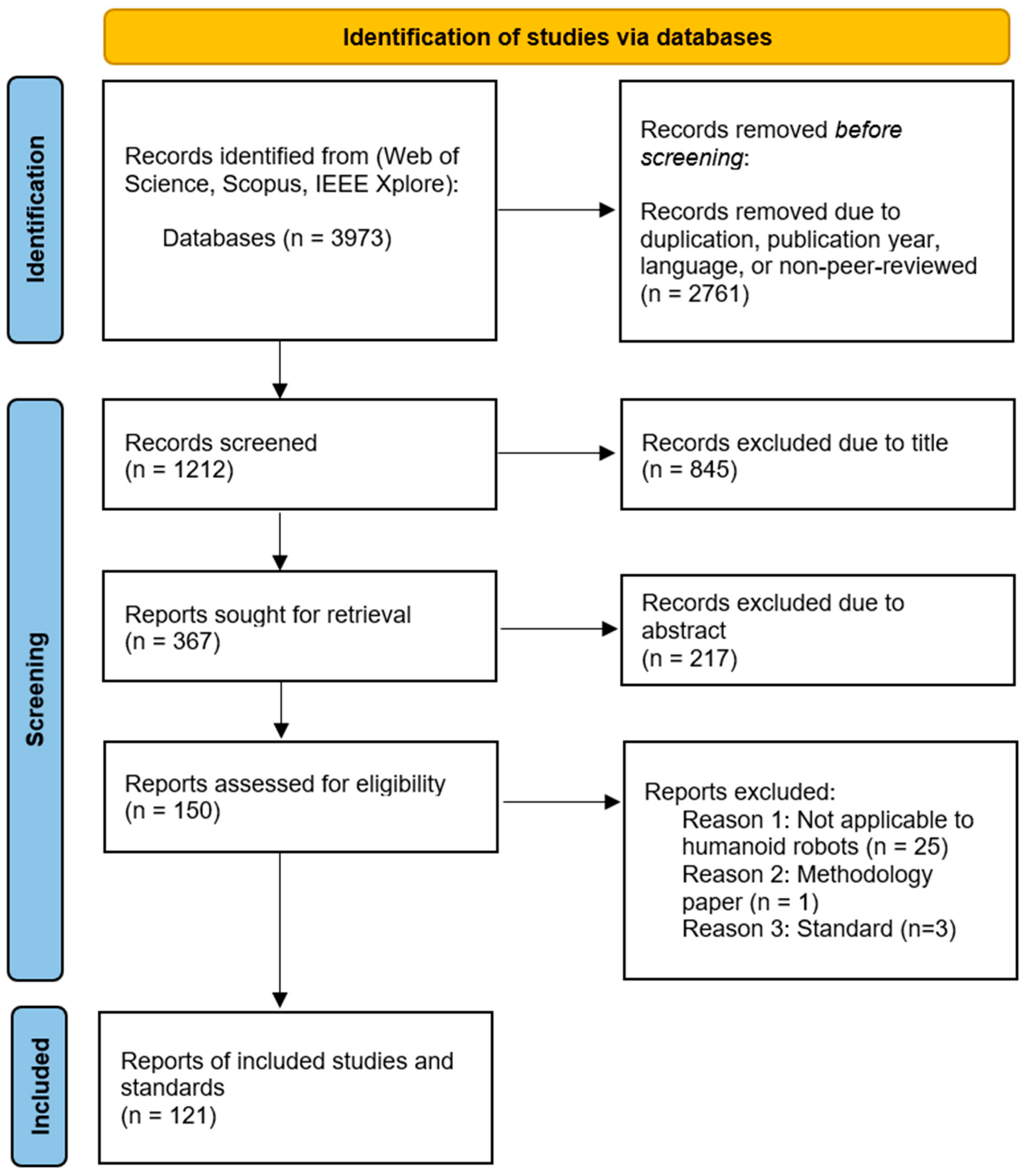 | RQ3 | (“humanoid robot” OR “collaborative robot” OR cobot) AND (“ISO 10218” OR “ISO/TS 15066” OR “ISO 13482” OR “IEC 61508” OR standard OR certification OR “risk assessment”) | Web of Science Scopus IEEE Xplore |