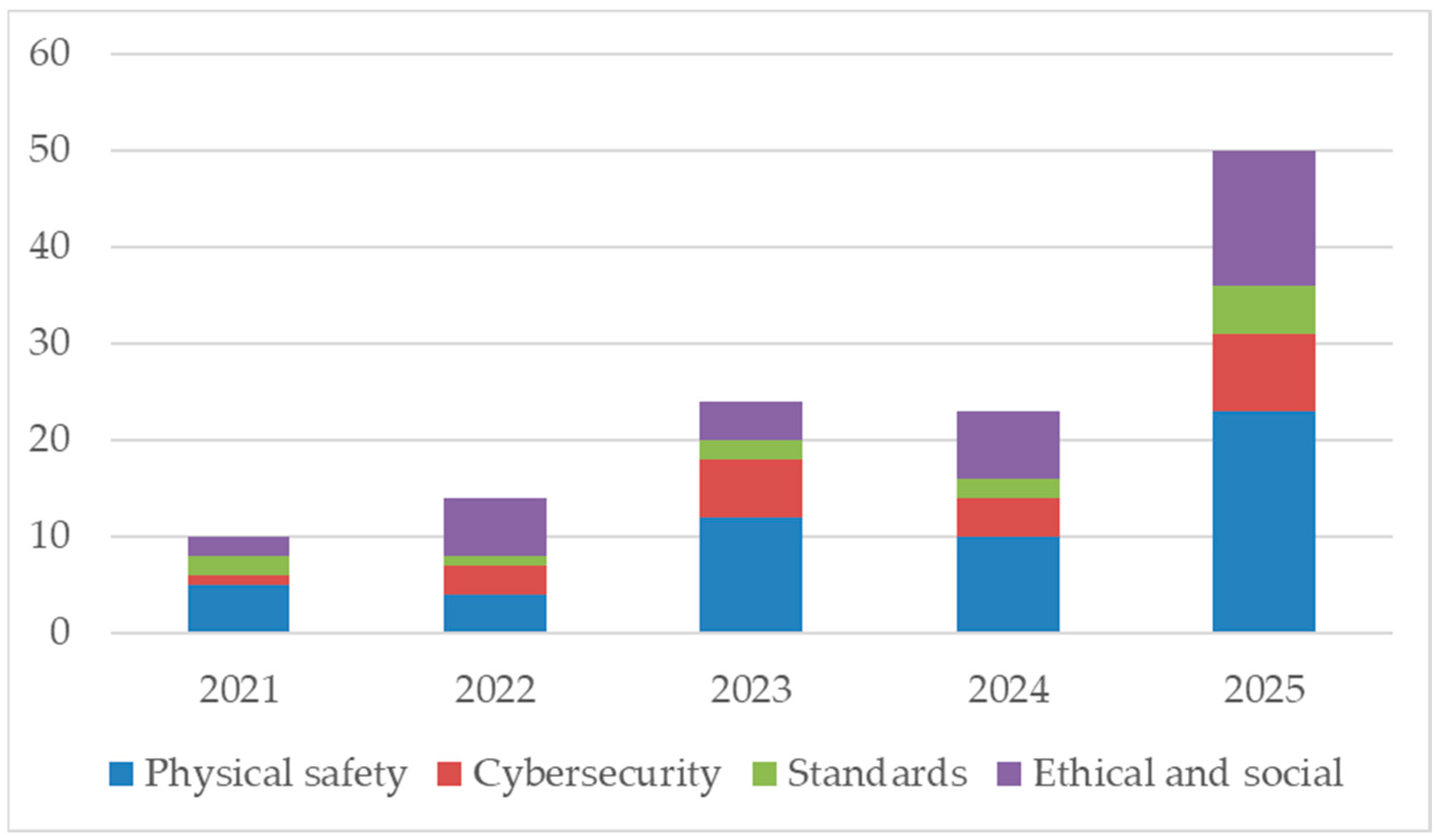 | Risk assessment and benchmarking gaps | PFMEA/HAZOP/FTA + data-driven incident archetypes; evidence-based benchmarking incl. safety and HRI quality | [24,25,39,102] | |