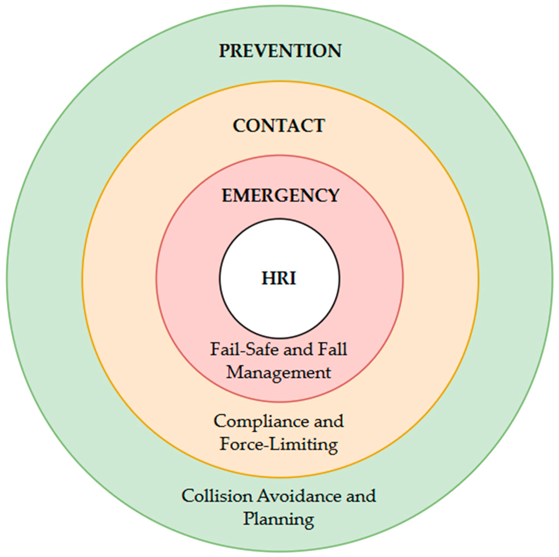 | RQ1—Physical safety | Proactive collision avoidance in shared spaces | Behavior-based safety layers; safety-metric controllers (minimum separation); null-space motion; proximity sensing + multimodal fusion; active vision | [1,26,46,47,48,49,50,51,52,53,54,55] |