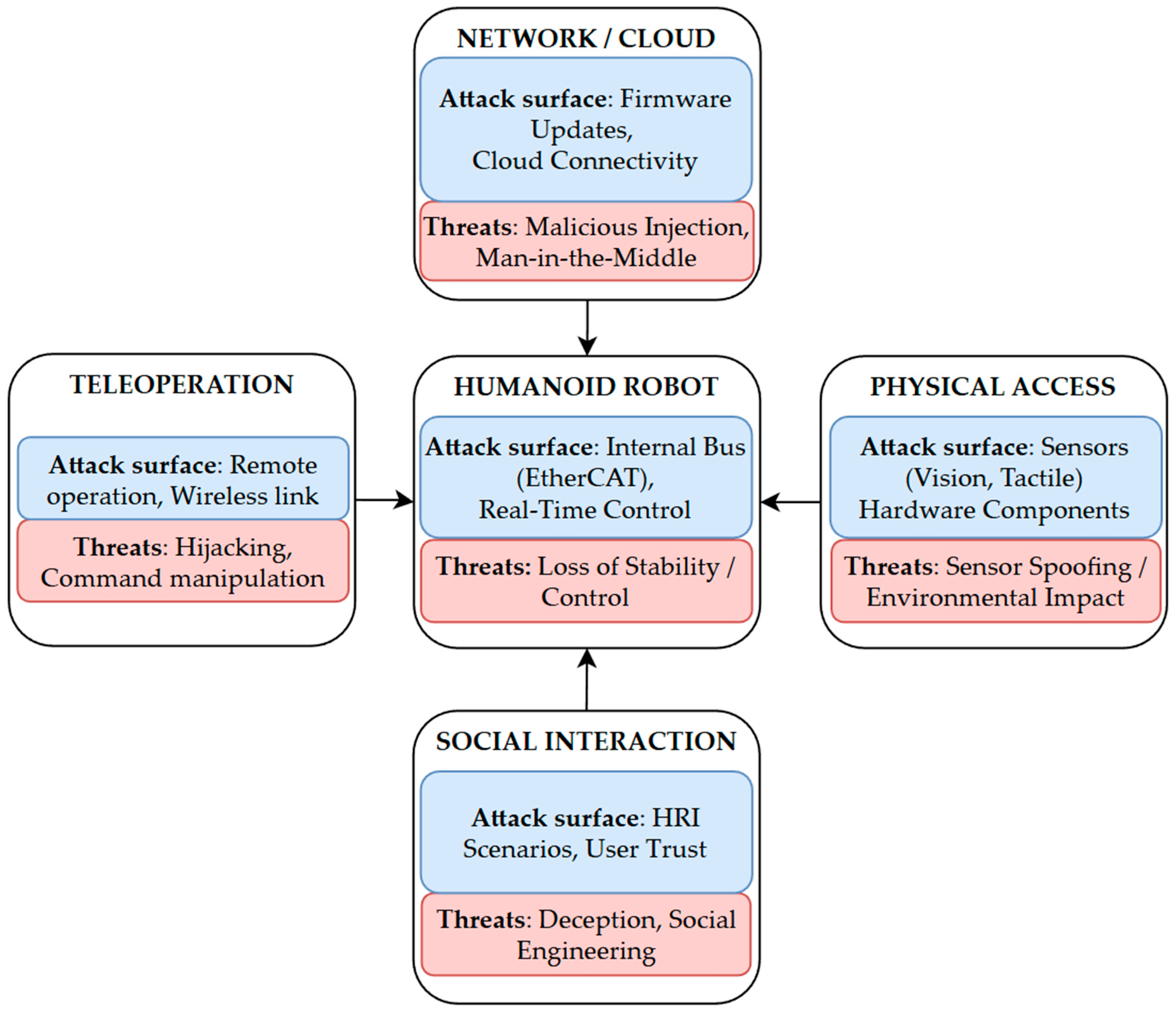 | RQ2 | (“humanoid robot” OR “anthropomorphic robot”) AND (cybersecurity OR “secure boot” OR “over-the-air” OR authentication OR “access control”) | Web of Science Scopus IEEE Xplore |