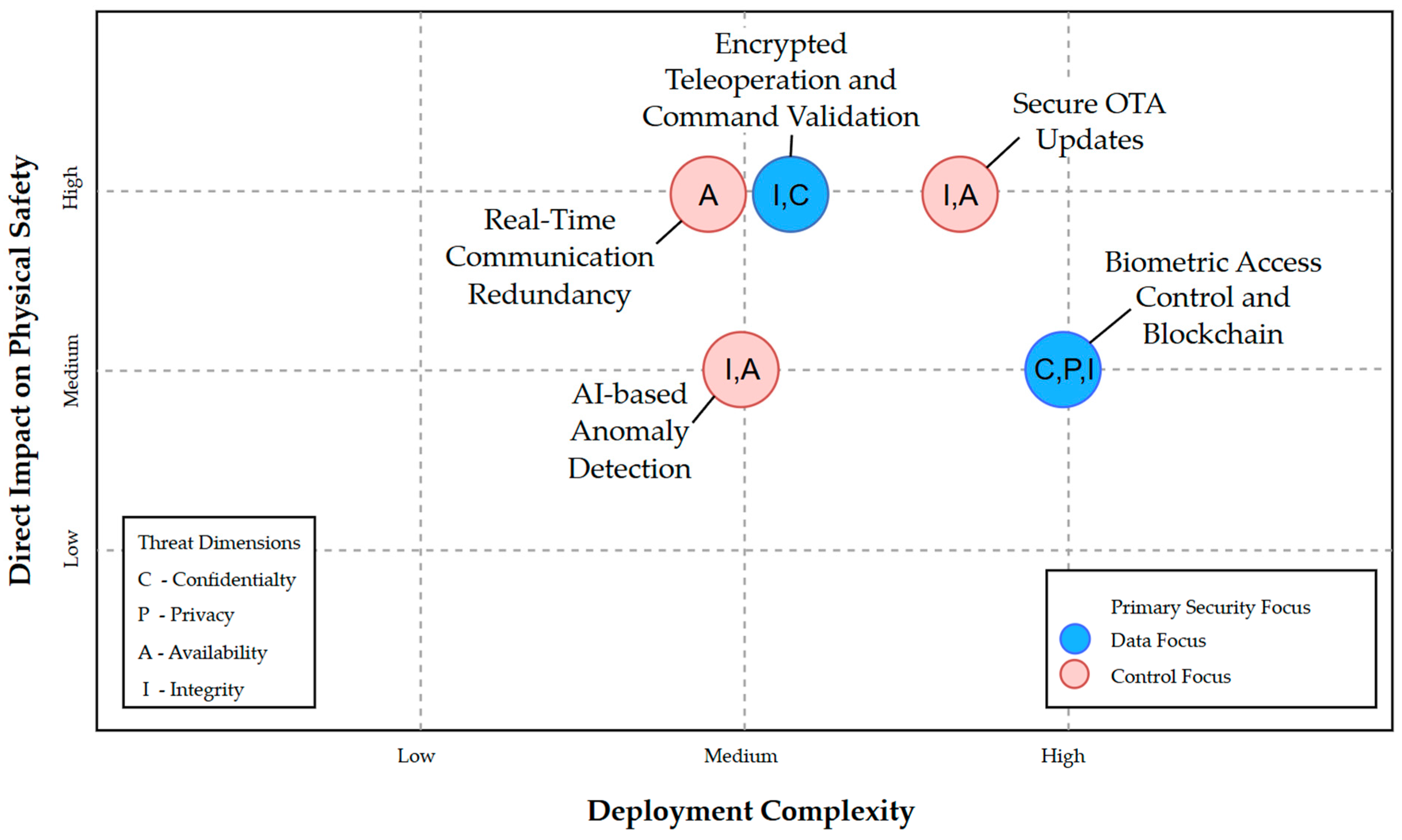 | Cybersecurity Measure | Primary Threat Dimensions Addressed | Deployment Complexity | Direct Impact on Physical Safety | References |