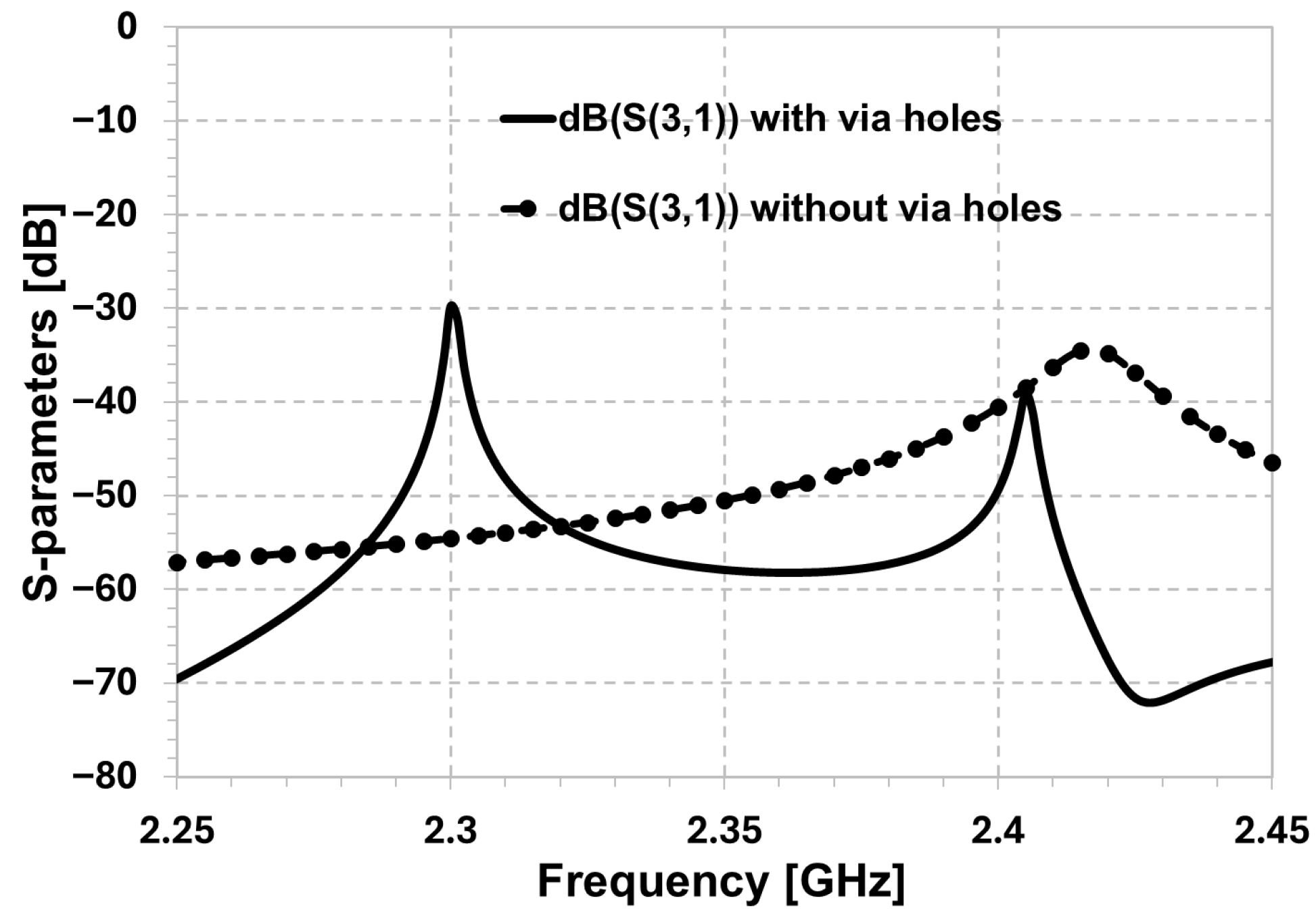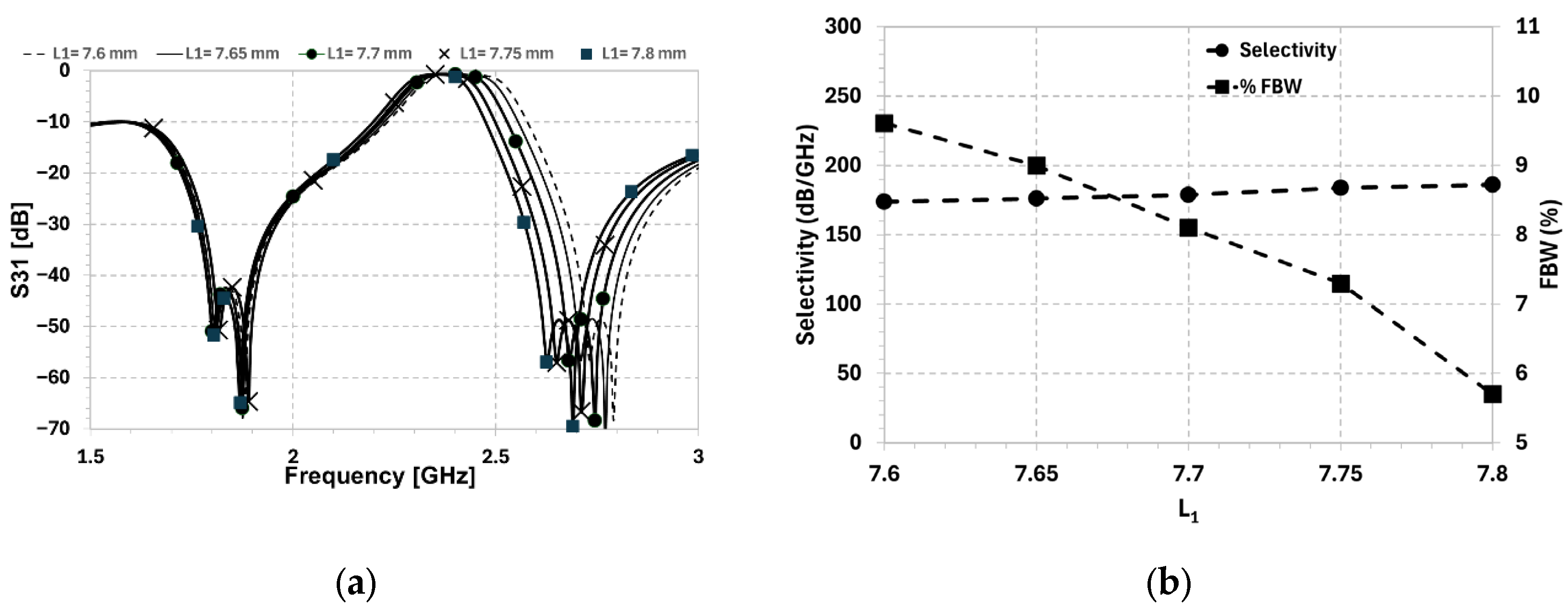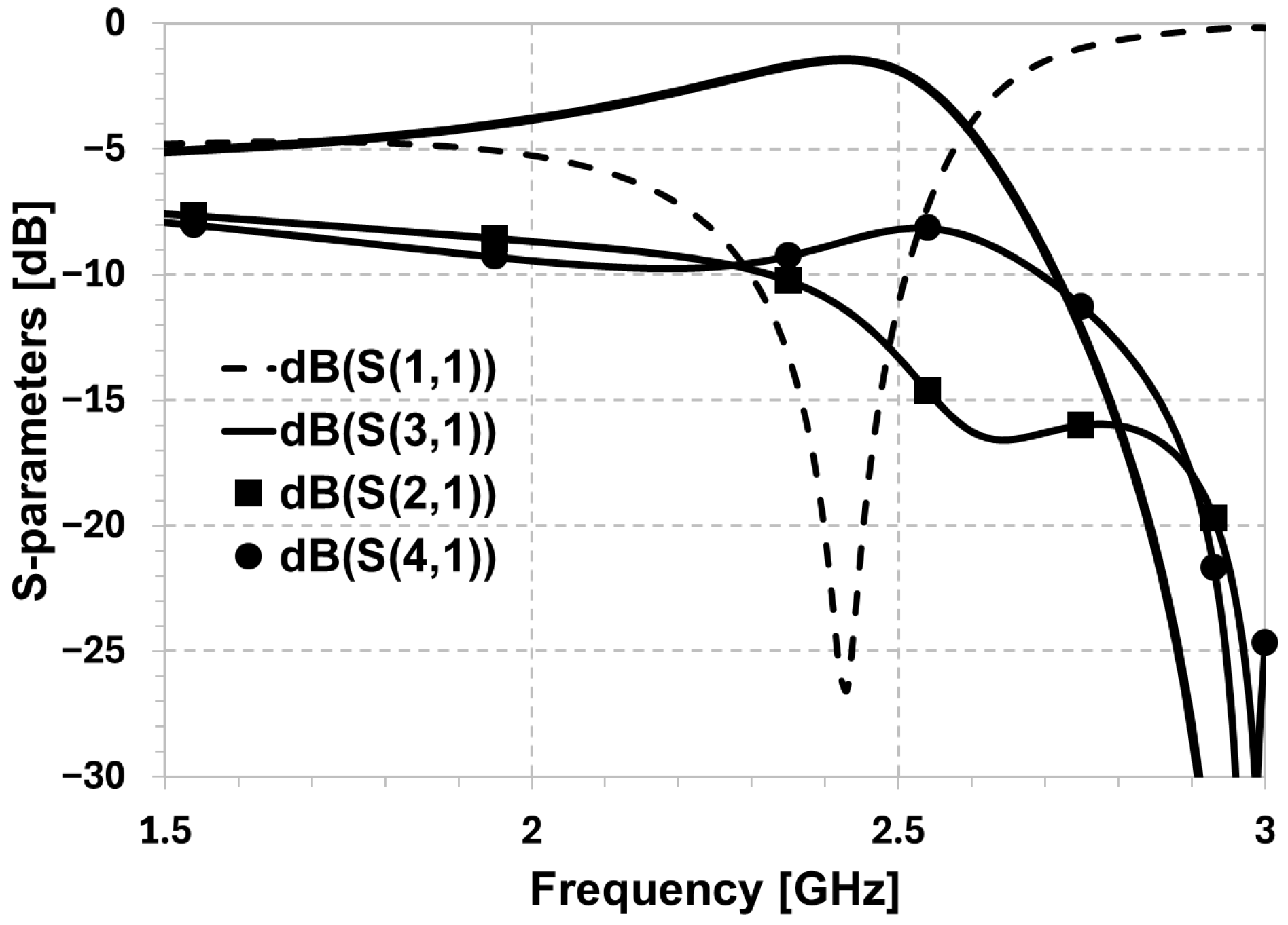 - Frequency Range: Simulations were conducted across the range of 1.5 GHz to 3.0 GHz to capture the full passband and out-of-band rejection characteristics.
