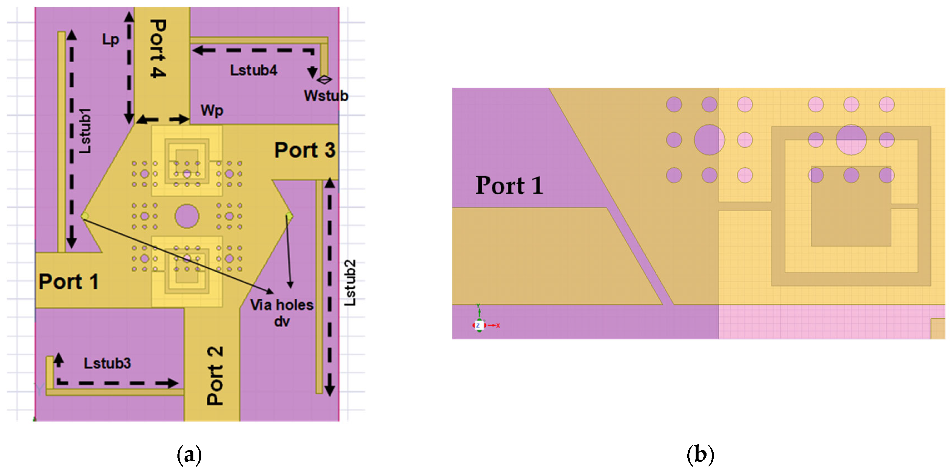 - Port Excitation: All four ports of the crossover were excited using 50 Ohm wave-ports.
