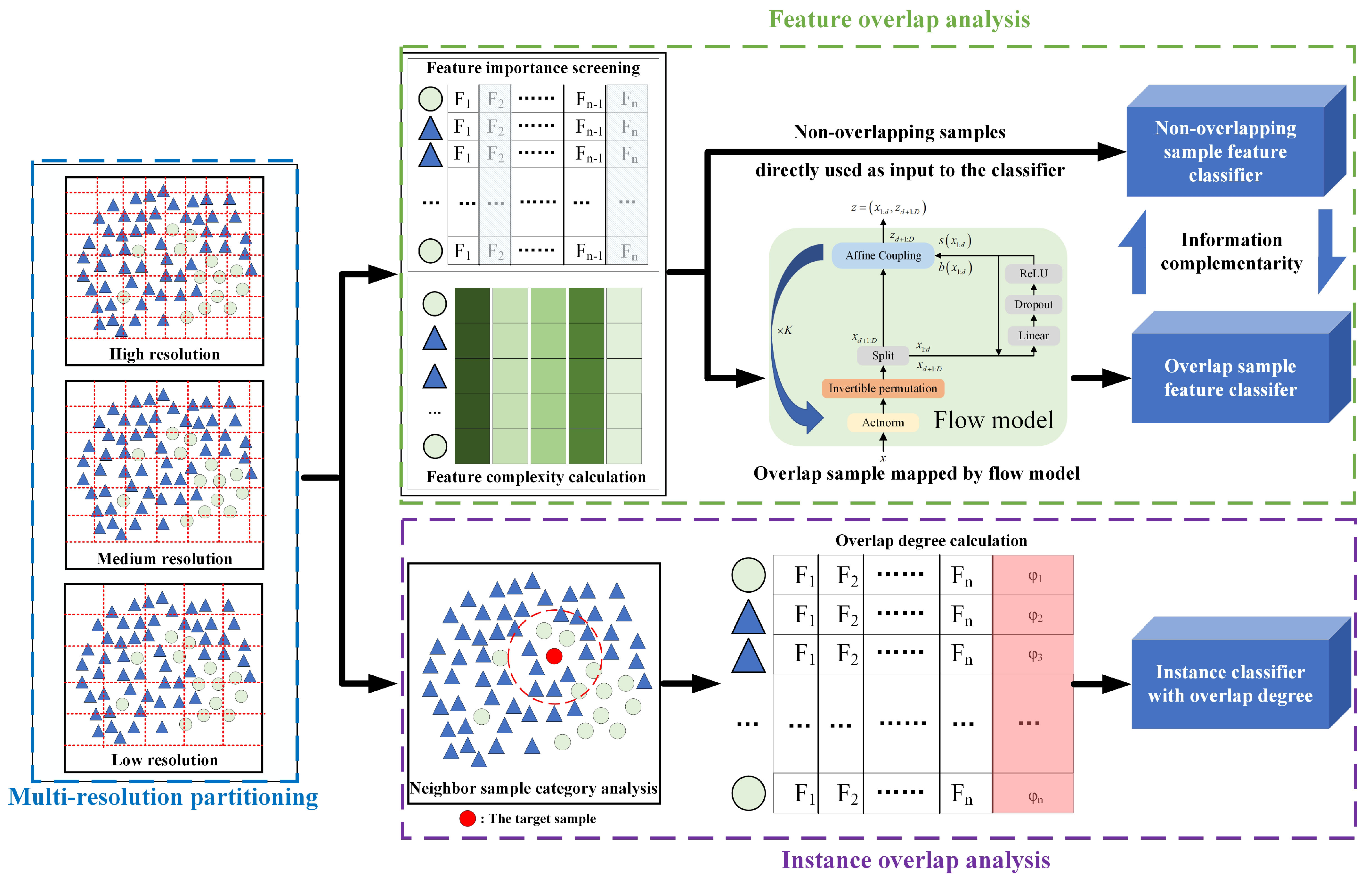 - A dual-perspective multi-resolution overlap measurement framework is proposed. We propose a unified framework that analyzes overlap from both “feature” and “instance” perspectives across multiple resolutions. This approach captures distributional information from local to global levels, overcoming the limitations of single-metric methods in identifying complex overlap patterns.