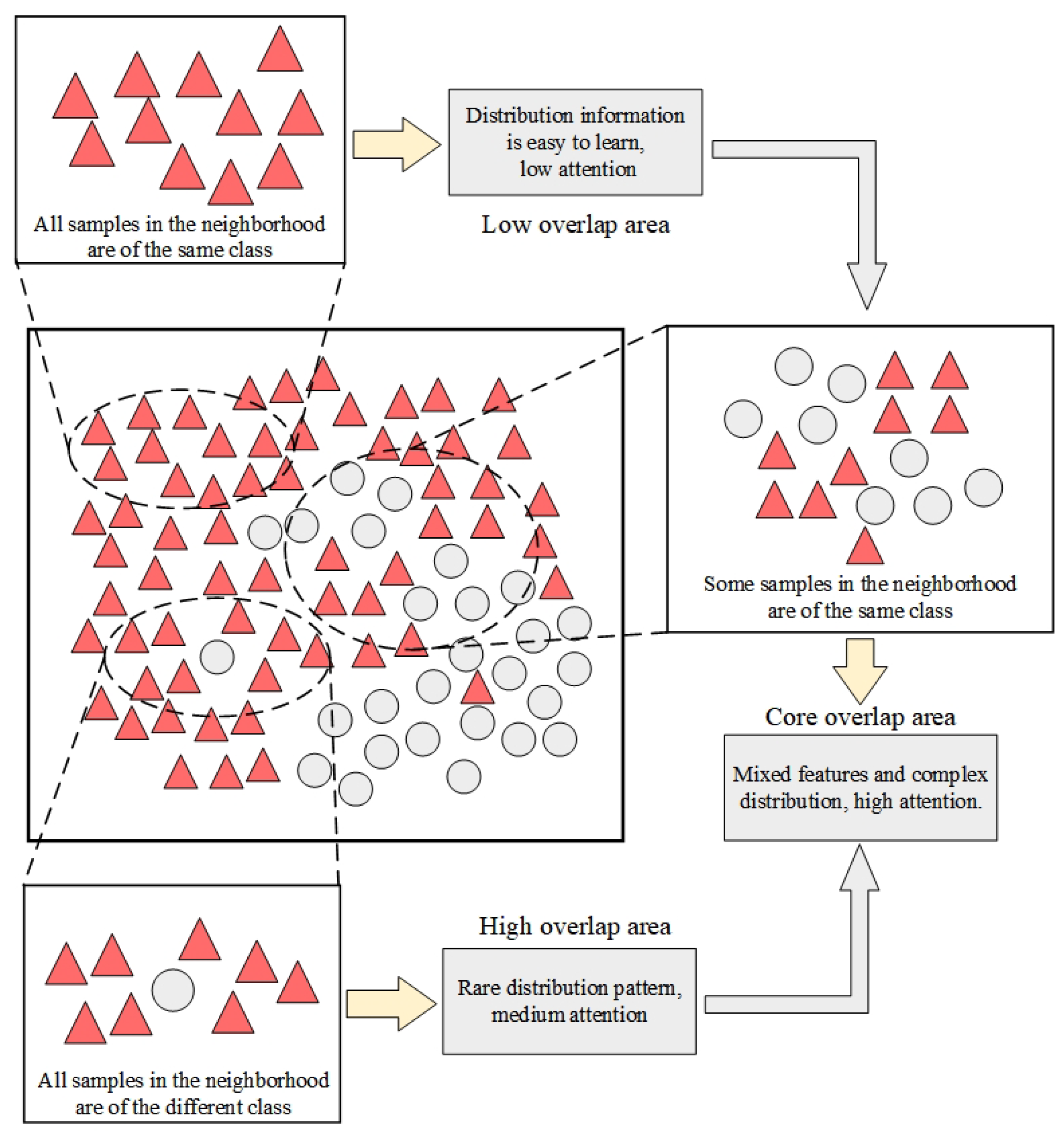 - A method for calculating attention weights based on multi-nearest-neighbor distribution discrimination in the data neighborhood is proposed. Focusing on “instance overlap,” we develop an adaptive weighting scheme that categorizes samples based on their neighborhood heterogeneity. This enables the model to selectively prioritize hard-to-classify boundary samples while suppressing noise and redundant information from the majority class.