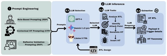 In the hardware security domain, LLMs have been applied to verification [18,19,20], secure hardware generation [20,21,22,23], and vulnerability detection and remediation [24,25]. Ahmad et al. [24] used LLMs to guide the fixing of security vulnerabilities. Fu et al. [25] trained domain-specific LLMs on a dataset of hardware defects and fixes to enable automated debugging. Saha et al. [26] provided an analysis of using GPTs for various hardware security tasks, including vulnerability insertion. They demonstrate ChatGPT’s capability to integrate vulnerabilities into hardware designs.