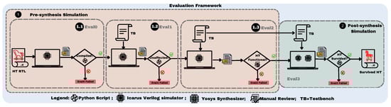 Designs passing the compilation stage undergo functional simulation using an open-source Verilog simulator with their original testbenches, as depicted by the “Unaffected?” decision point in the next stage of Figure 3. We analyze the resulting simulation logs to check if the intended original functionality is preserved when the HT is dormant. This crucial step, implemented with a Python script, validates HT stealthiness. We capture this using the Normal Operation Preservation Rate parameter (Eval1), representing the fraction of designs that maintain correct functionality in non-triggering conditions.
