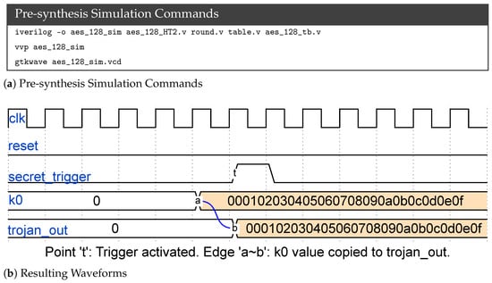 - Cruz, J.; Huang, Y.; Mishra, P.; Bhunia, S. An automated configurable Trojan insertion framework for dynamic trust benchmarks. In Proceedings of the 2018 Design, Automation & Test in Europe Conference & Exhibition (DATE), Dresden, Germany, 19–23 March 2018; pp. 1598–1603. [Google Scholar]