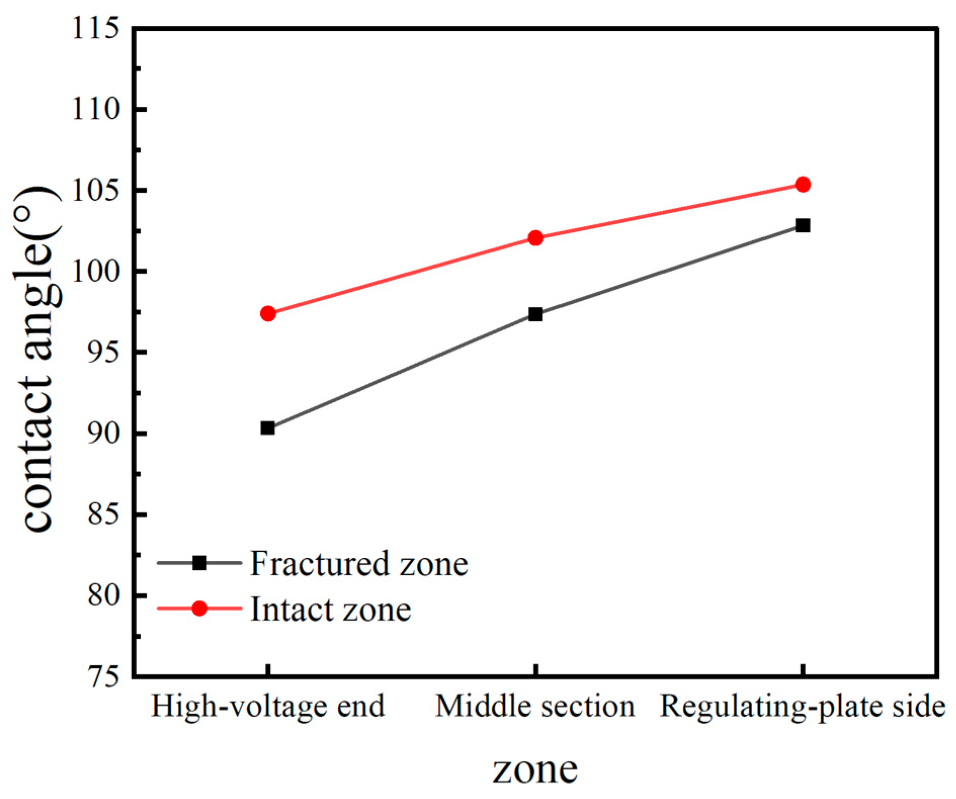 Figure 2. The fractured spacer exhibited a slight decrease in hydrophobicity at the high-voltage end, whereas the middle and adjusting-plate sections maintained similar levels to those of the intact sample. Overall, the measured contact angle remained within the acceptable range for field operation.