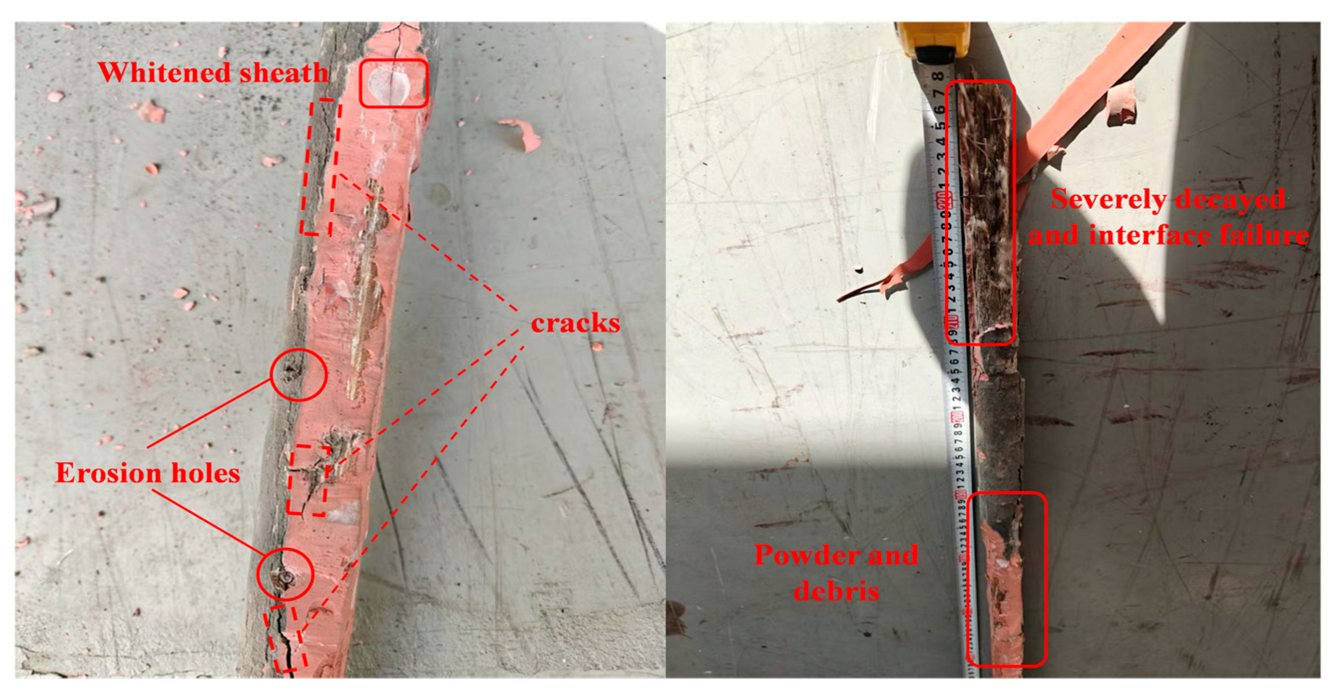Figure 3, the sheath near the fracture could be easily separated from the core, exhibiting a hardened, brittle, and powdery texture—evidence of complete interfacial debonding. The exposed core surface appeared dark and porous, consistent with moisture-induced degradation.