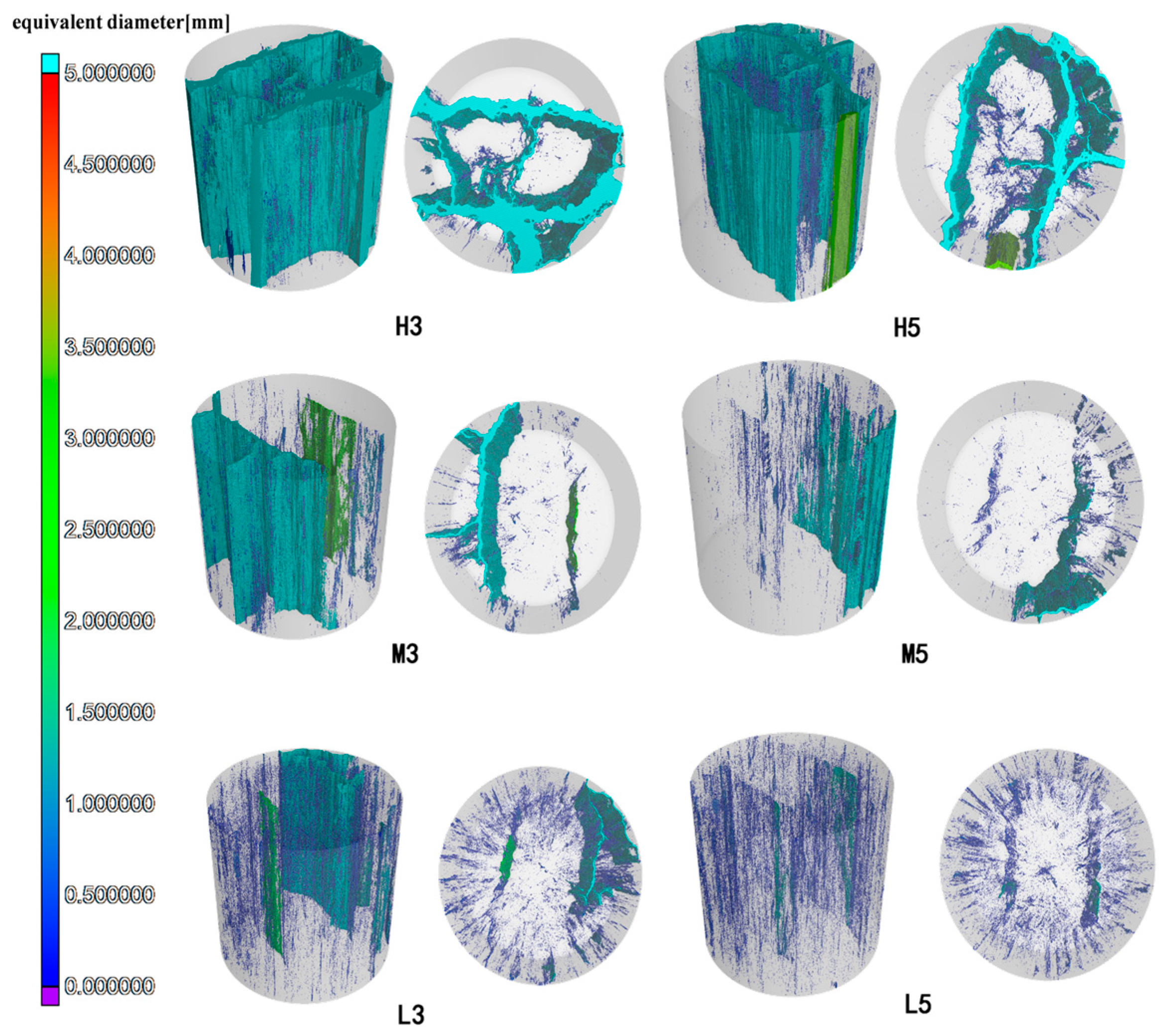 Figure 6. Pores and voids were classified by equivalent diameter and color-coded for visualization. For each degradation zone, two non-contiguous samples were scanned for comparison. As shown in the 3D maps, the relative defect size followed the order H3 > H5 > M3 > M5 > L3 > L5, indicating that both the number and volume of internal voids decreased with distance from the fracture. Quantitative analysis results are summarized in