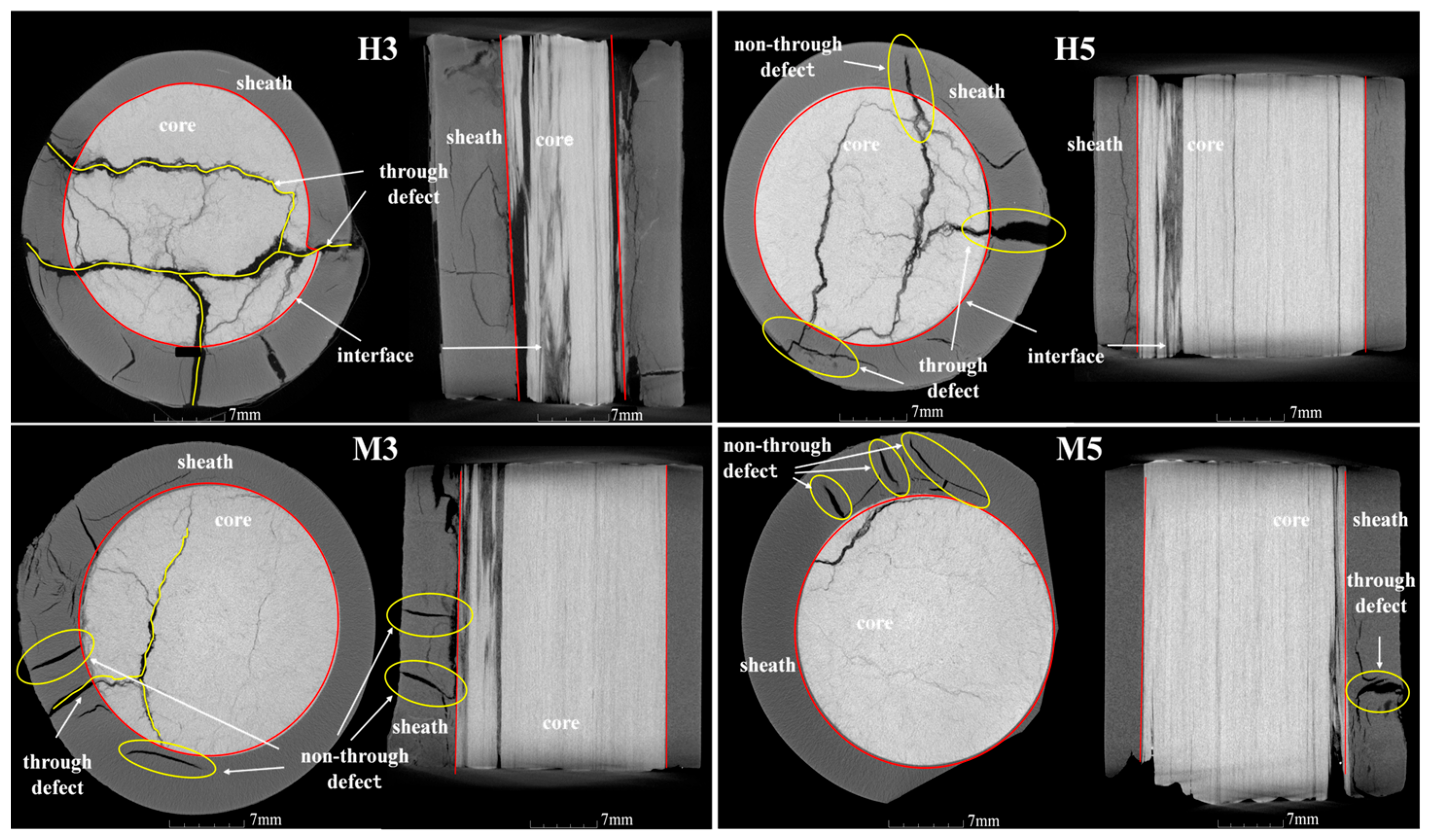 Figure 7). From these scans, the CT results revealed that all samples contained cracks of varying severity, including partially penetrating cracks within the sheath and interfacial defects between the core and sheath that weakened adhesion. In H5, M3, and M5, several cracks originated from the core–sheath interface and propagated outward, but had not yet penetrated the sheath; these cracks are expected to evolve into fully penetrating cracks with further degradation. In contrast, H3, H5, and M3 already exhibited cracks that penetrated through the sheath, extending deep into the core rod. In particular, H3 and H5 contained cracks that had fully penetrated the core, while M3 exhibited cracks approaching full penetration.