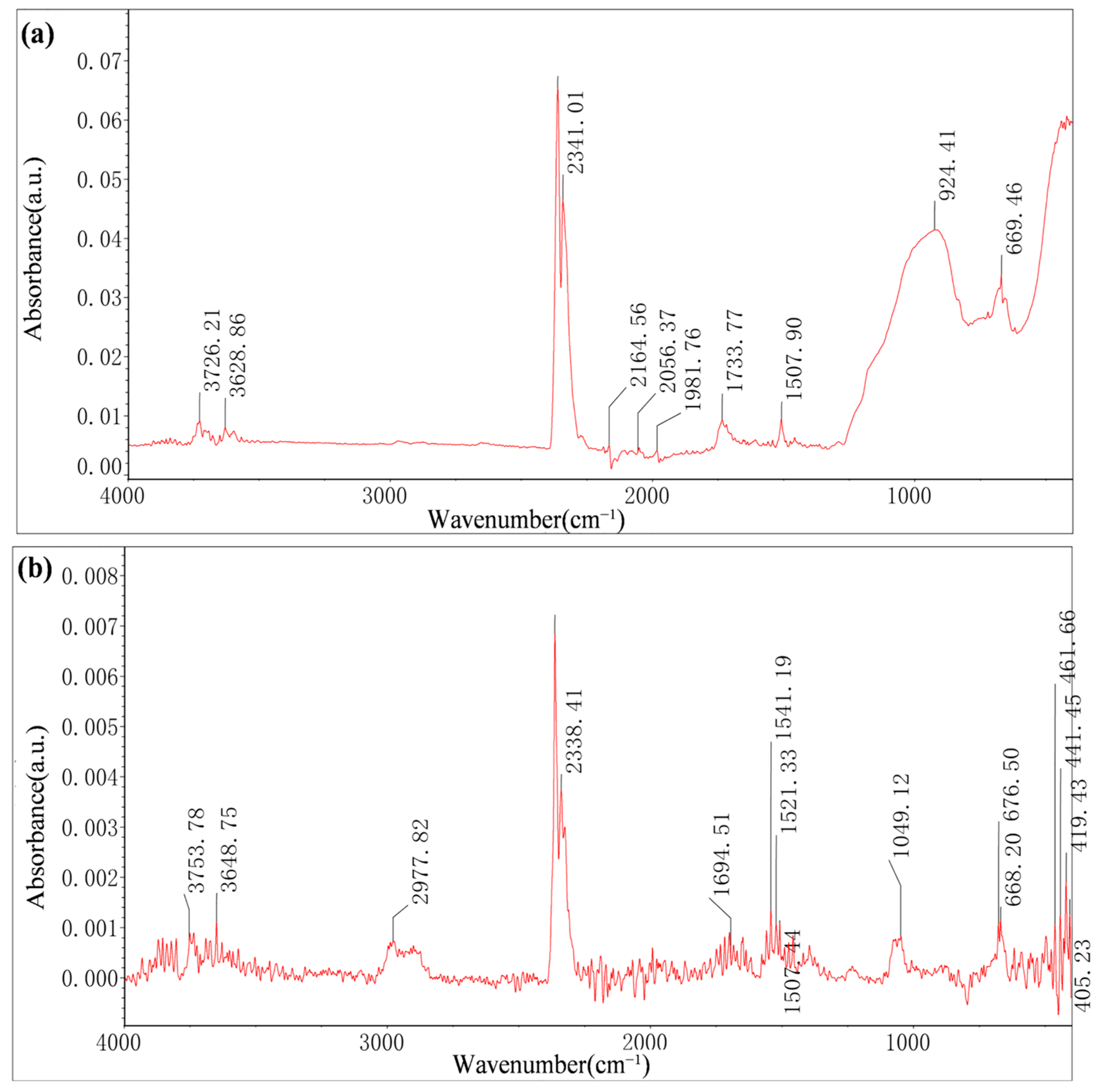 Figure 8. The FTIR spectra of the fractured core rod differed significantly from those of the intact region, with marked changes in vertical scaling and more complex spectral contours. Distinct absorption peaks appeared at 3600–3700 cm