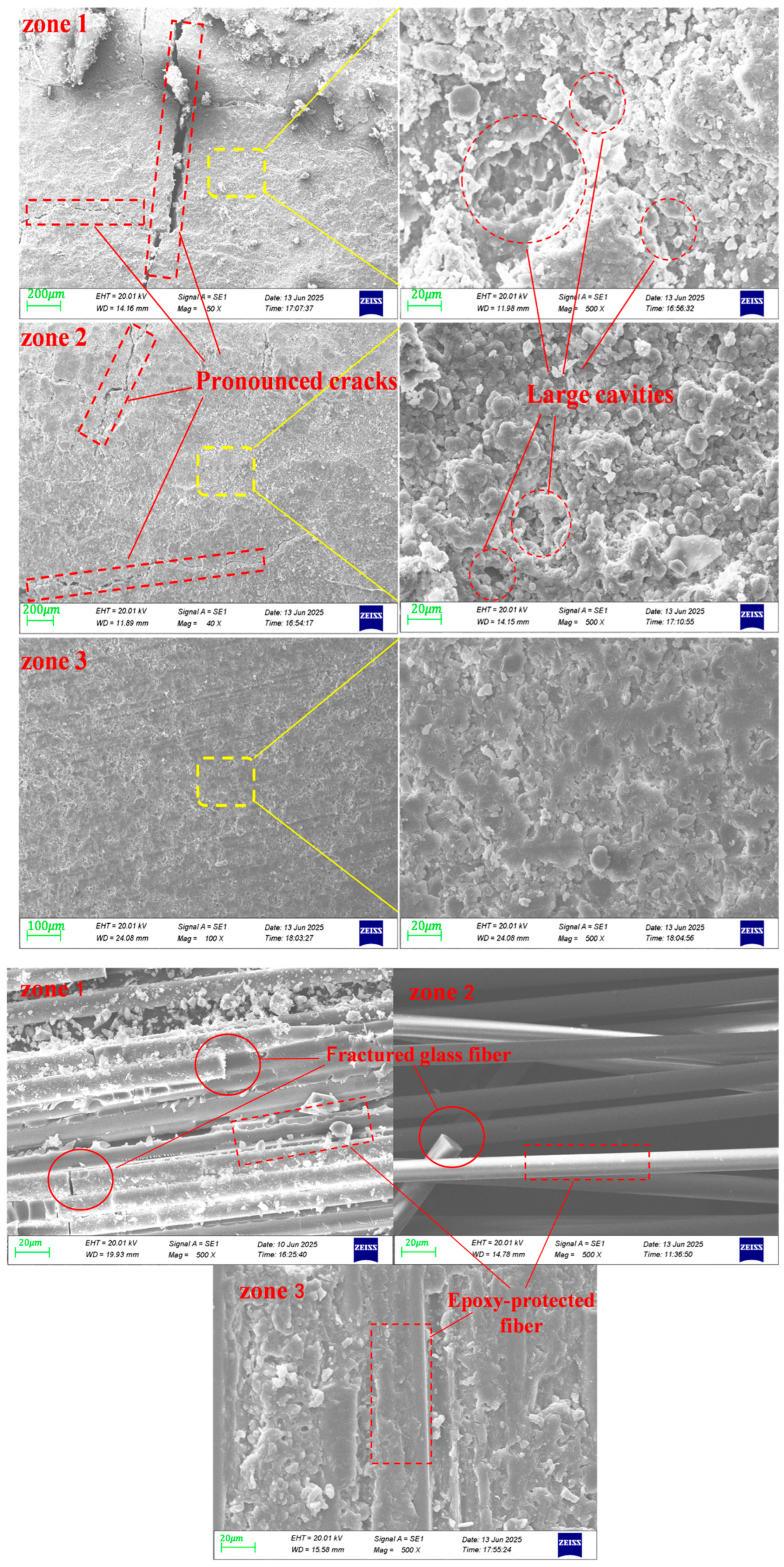 For the core rod, fibers in the fractured region were partially broken or exposed due to resin loss, whereas in the intact region they remained uniformly encapsulated by the epoxy matrix. The interfacial area between fibers and matrix in the fractured zone became discontinuous and loosely bonded. These microscopic observations provide direct evidence of the synergistic degradation of the sheath and core rod, corroborating the results obtained from FTIR and CT analyses.